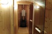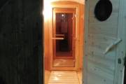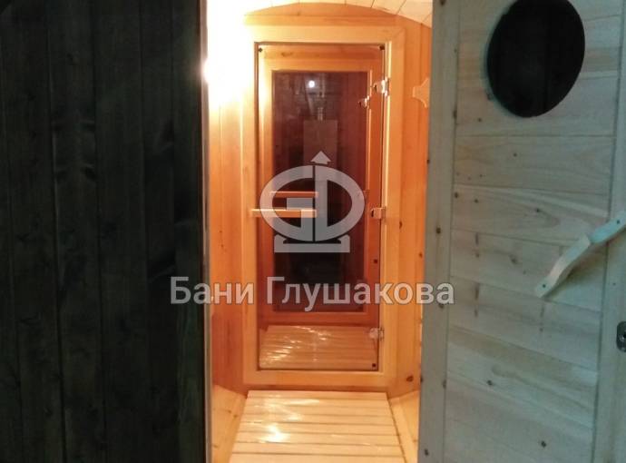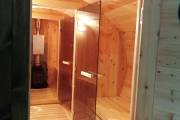 Баня большая — 5 метров в длину, 2,4 в самом широком месте. На входе установлена надёжна «Корабельная» дверь с круглым окошком. Внутри поставлены 2 стеклянные двери на магнитных замках — самый лучший вариант для влажных помещений с высокой температурой. В предбаннике поставлены скамейки с откидными крышками — в них есть специальные места для хранения. Есть небольшой столик.