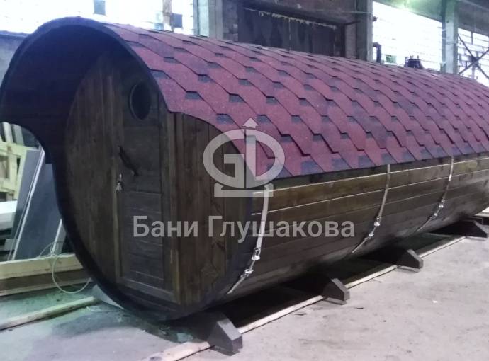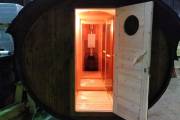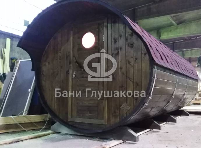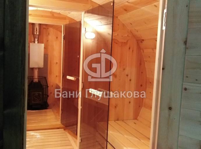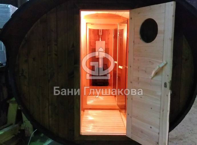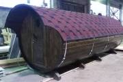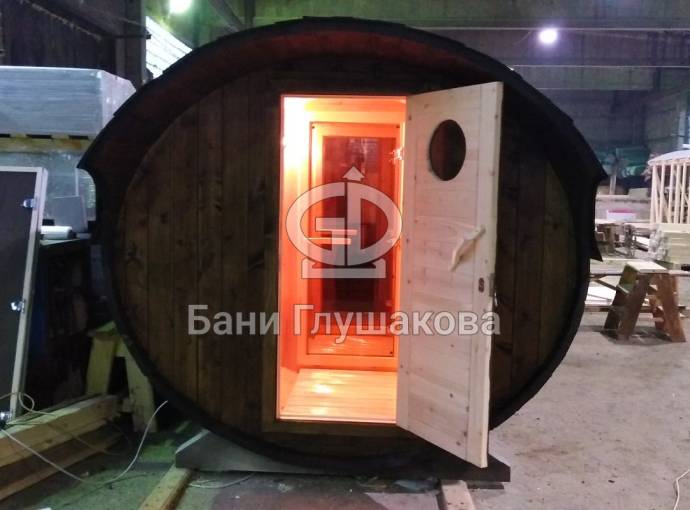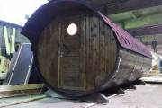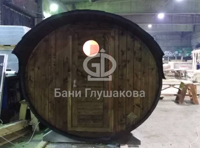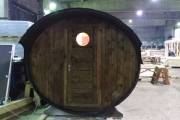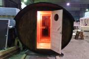 Перед самым Новым годом изготовлен новый выставочный образец овальной бани-бочки из кедра на 3 отсека: внутри есть предбанник, моечное отделение и парная. Баня изготовлена из сортированного кедра, поэтому цена ниже, чем при изготовлении бочки на заказ.