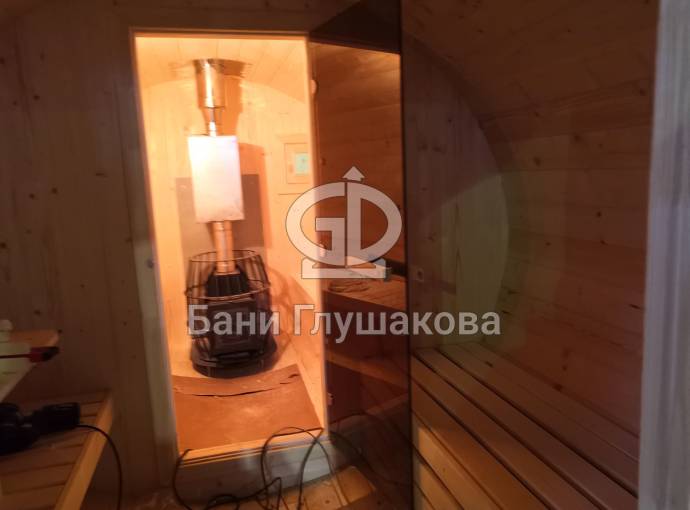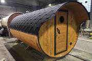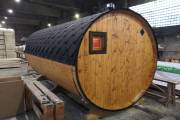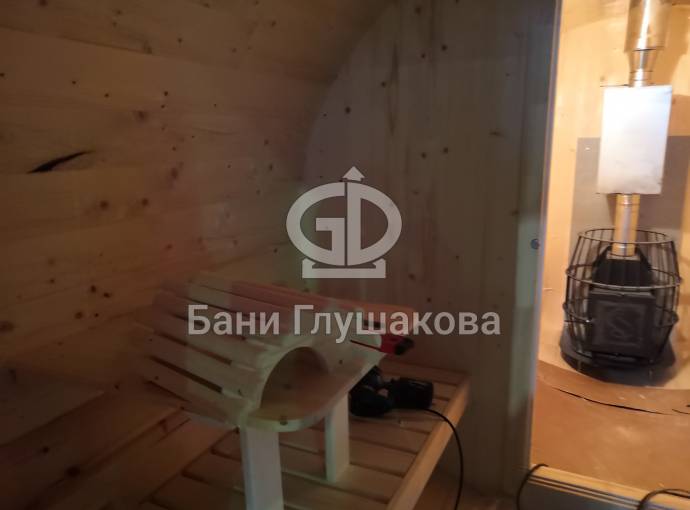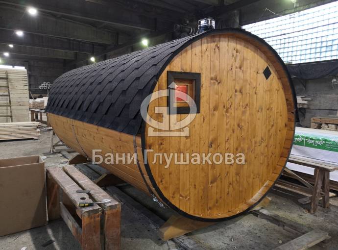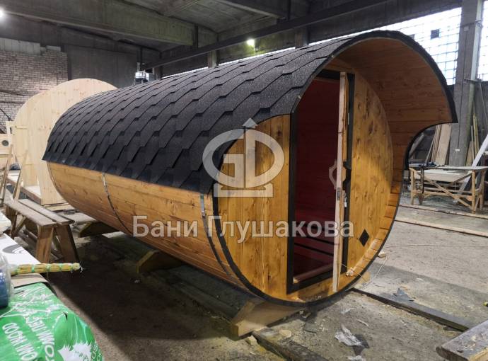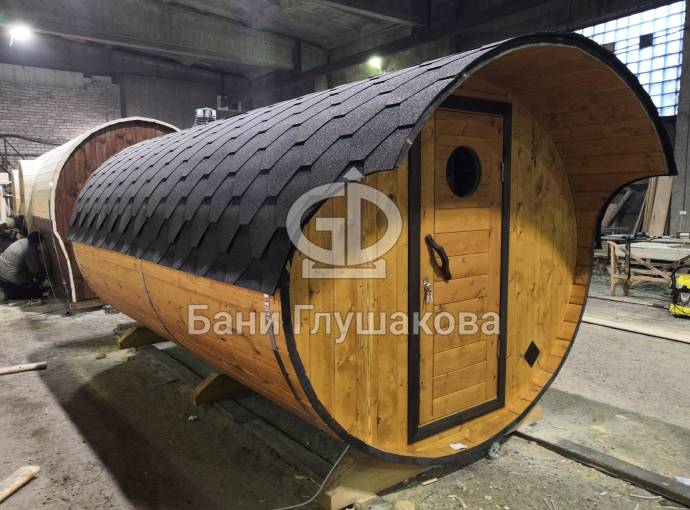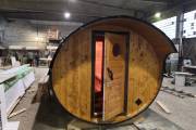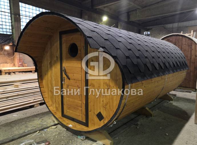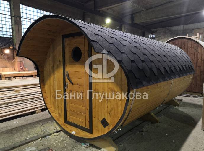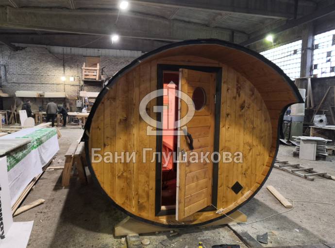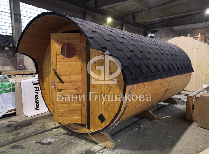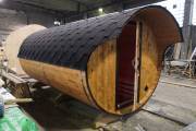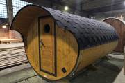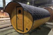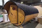 Во второй половине января 2020 была изготовлена новая овальная баня бочка с козырьком для нашей выставочной площадки. Внутри 2 отделения: предбанник и парная. Размер небольшой — всего 4 метра.