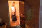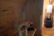 Установлена стандартная печь Бочонок Компакт от ПечЪнов, в парной по обе стороны от печи поставлены пологи, повешены светильники. На полу трапик. Помещения разделены стеклянной дверью. В предбаннике есть откидной столик, одна простая скамейка и одна с откидной крышкой — внутри есть ящик для хранения.