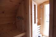 В остальном овальная баня бочка с козырьком копирует другие модели круглых бань такого типа: сборка из сухой бочковой доски, полная отделка под ключ, установка печи и печное оборудование, двери-окна, пологи, трапики — все входит в общую цену.