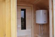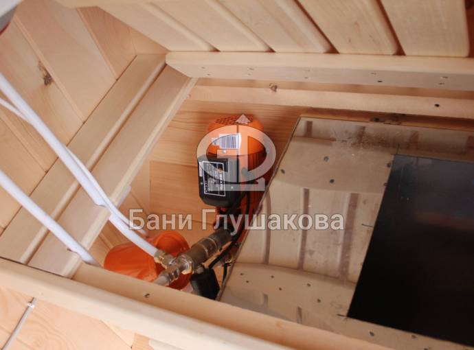 Можно установить насосную станцию, бойлер, бак, душ, устанавливается как в душевой комнате так и в маленькой бане, но уже слева или с права в комнате отдыха, а душ выводится в этом случае в парную.