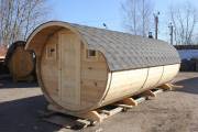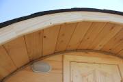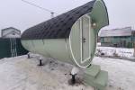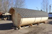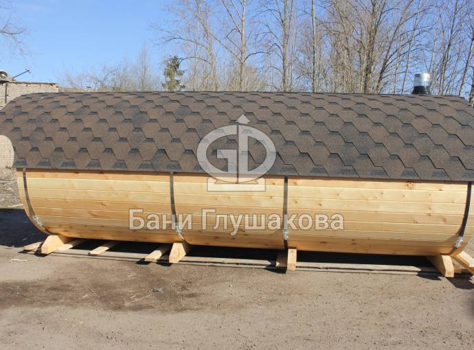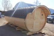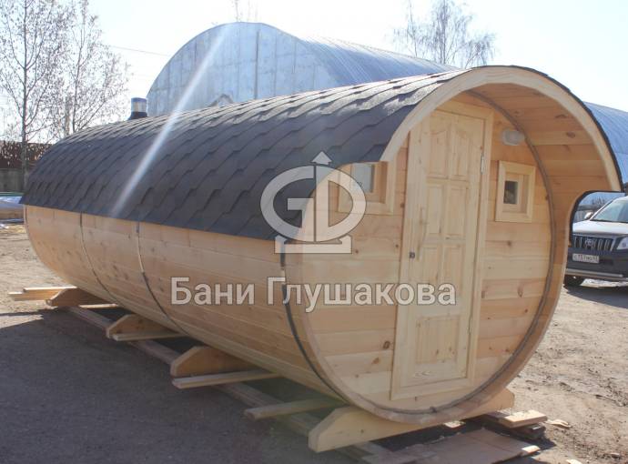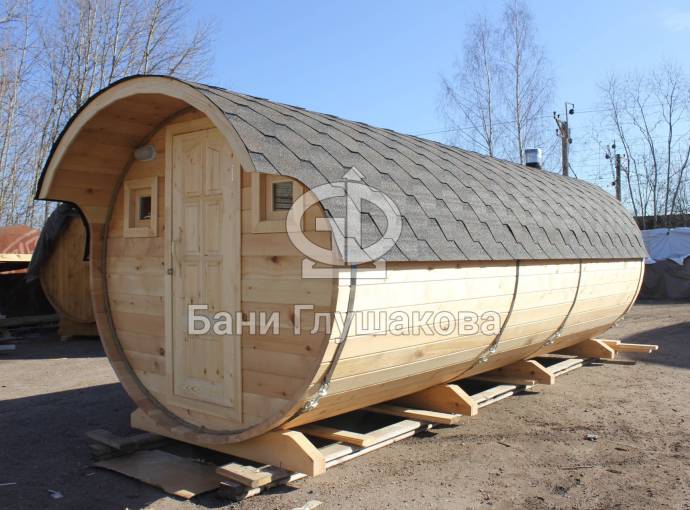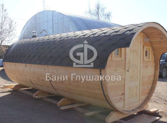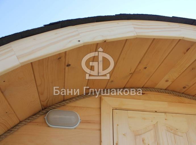 Пятиметровая модель бани бочки овальной формы с козырьком имеет внутри два отделения: предбанник и парную. Баня бочка «Рязанская» — это чистый холст, на котором можно нарисовать все, что угодно. Выберите любой цвет внешних стен, печь любой фирмы, стеклянные или деревянные двери, параллельную или угловую схему расположения пологов в парной.
