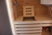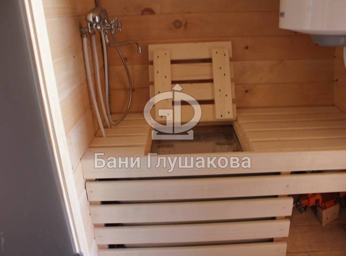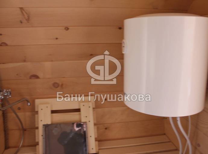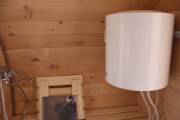 Можно установить насосную станцию, бойлер, бак, душ, устанавливается как в душевой комнате так и в маленькой бане, но уже слева или с права в комнате отдыха, а душ выводится в этом случае в парную.