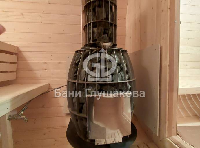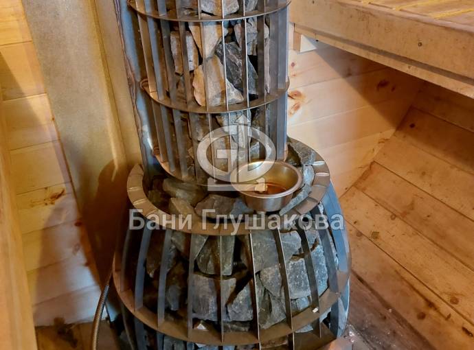 Компактная, красивая, надёжная. Оснащена встроенным парогенератором. Вода подаётся в чашу, оттуда по трубкам она проникает внутрь камней — получается отличный мелкодисперсный пар.