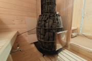 Помимо основной сетки с камнями на трубе расположена вторая каменка. За ней спрятан бак для воды на 55 литров — 3-4 человека могут помыться, не жалея воды. Кран выведен под полок — и это очень удобно.