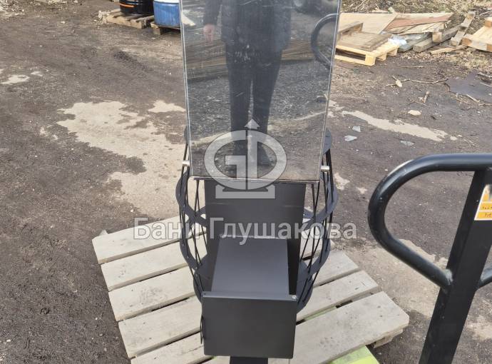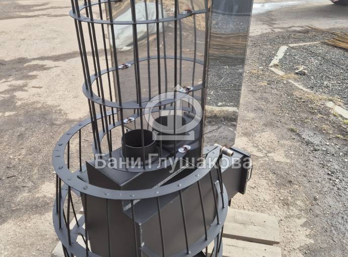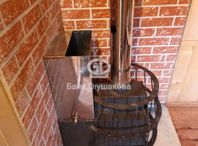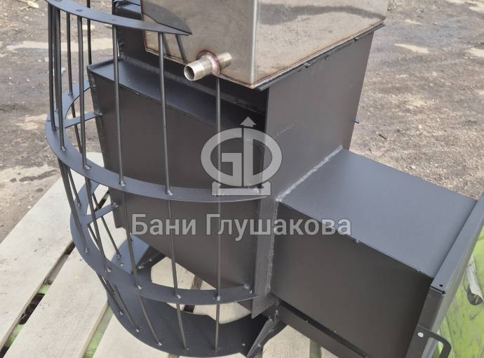 Оснащена выносной топкой – сама печь располагается в парной, а топка через стену и металлический или кирпичный экран в соседнем помещении. Бак расположен ближе к стене, что существенно экономит место. К тому же, это более безопасно.