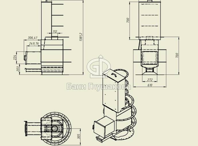 Одна каменка располагается вокруг печи в виде бочонка. Вторая – на трубе. Благодаря продуманной консрукции бак греется не слишком интенсивно – он никогда не закипит и не прогорит. Подробное описание смотрите в видео!