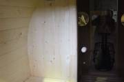 Можно установить один или более светильник у входной двери бани бочки снаружи, подробнее по ссылке, в комплект входит покраска его в цвет окантовки бани, подключение на отдельный выключатель, светодиодная лампа. Стоимость 1700 рублей за штуку