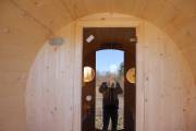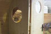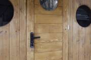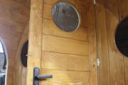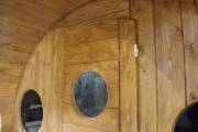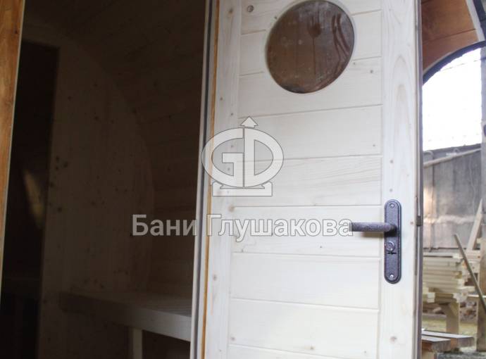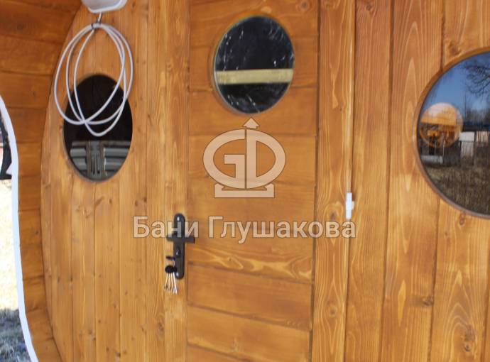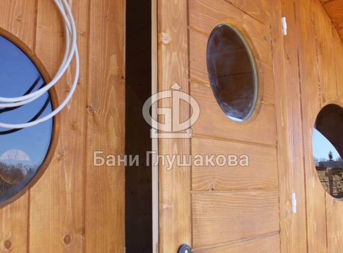 На входе установлена концептуальная каркасная дверь с округлым верхом и низом, которая подчеркивает необычную форму бани.