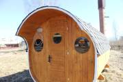 Перед вами самая большая перевозная баня из новой авторской линейки «Пятачок». Её длина составляет 5,7 метров, что позволяет внутри разделить пространство на три помещения (сауна, душевая, предбанник), а снаружи устроить небольшую террасу.
