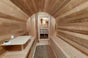 Замечательная расстановка в просторной парной: широкие полки поставлены углом, а печь сбоку. Поверьте нашему многолетнему опыту — это и правда самый удобный вариант.
