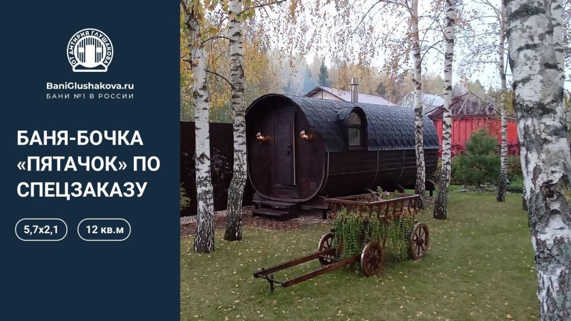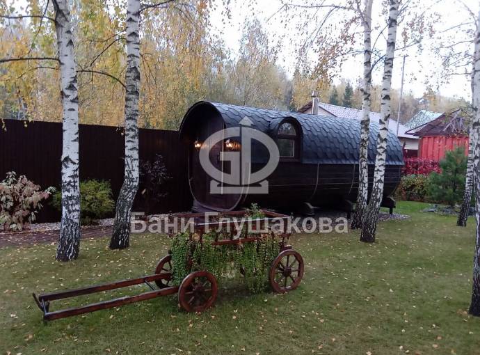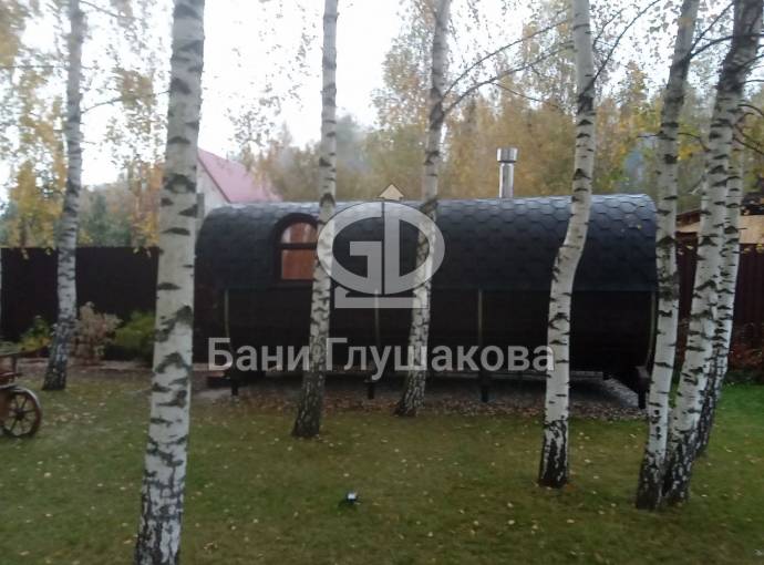 Эта модель бани бочки не является стандартной. Это спецзаказ, который был создан на основе проекта «Пятачок». Баня каркасной сборки длиной 5,7 метров, а по козырьку 6 метров. Сложно на неё сформировать конкретную цену, так как она является производной от любой другой бани «Пятачок»: