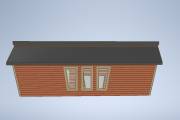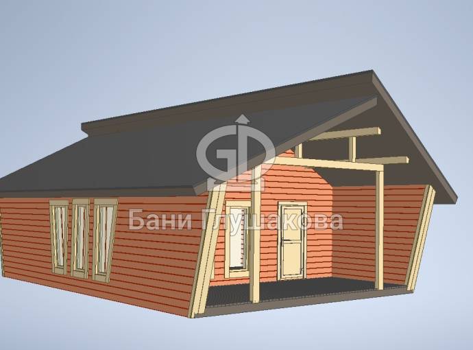 В стадии разработки новая линейка дачных домиков и бань «Садко» с наклонными стенами, разноуровневой крышей, террасой и дровяником.
