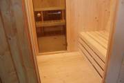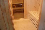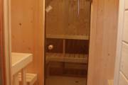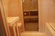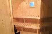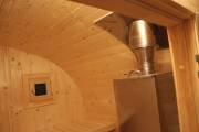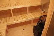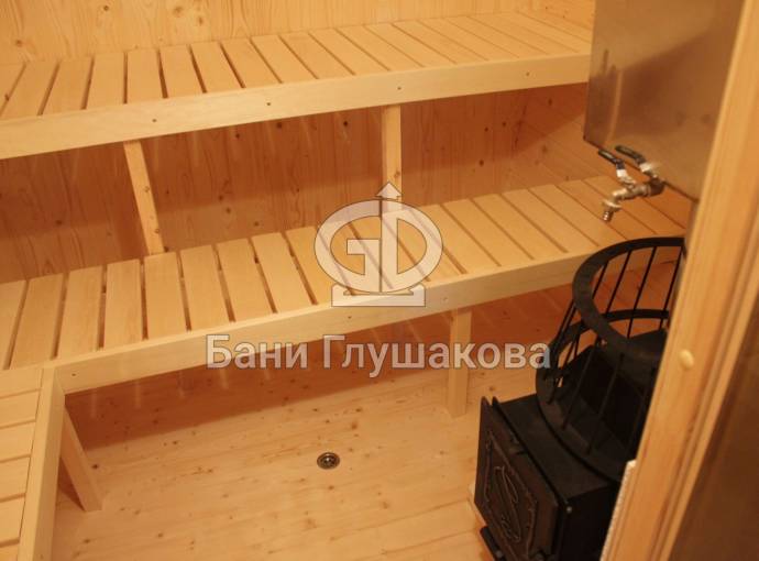 Внутри всего 2 помещения: предбанник и парная. Печь в сауне расположена сбоку, что гораздо удобнее и безопаснее в плане эксплуатации. Полки расположены углом.