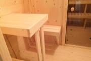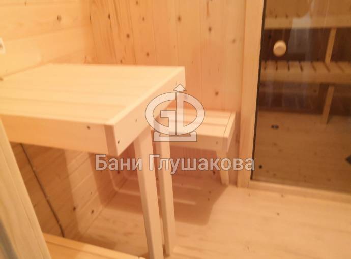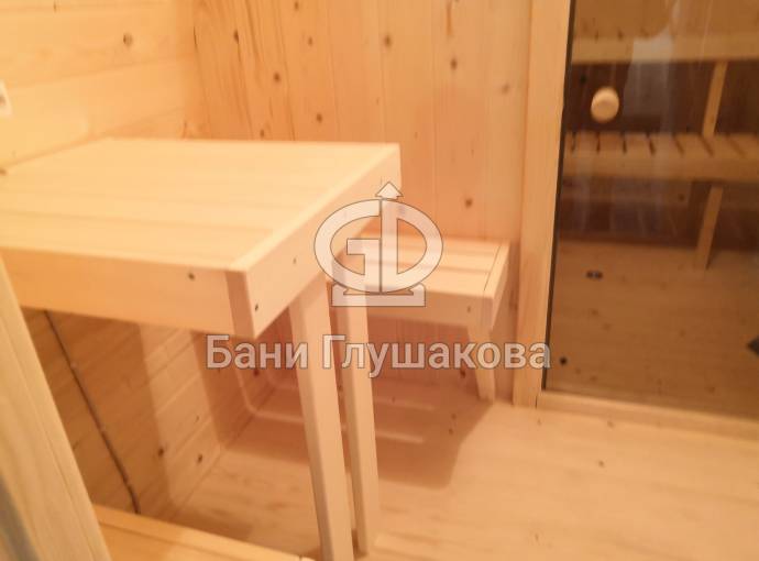 В предбаннике установлены скамейка с откидным верхом, столик и скамейки.