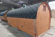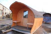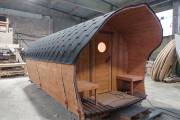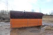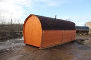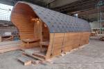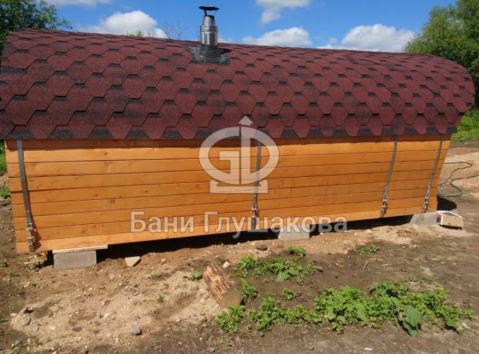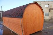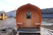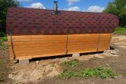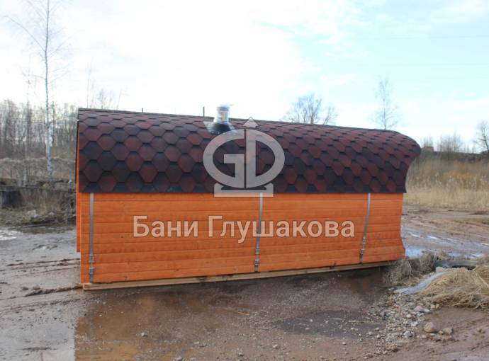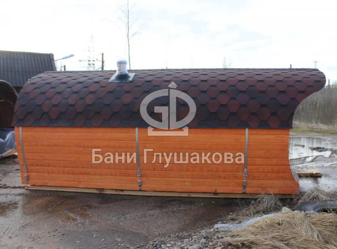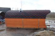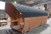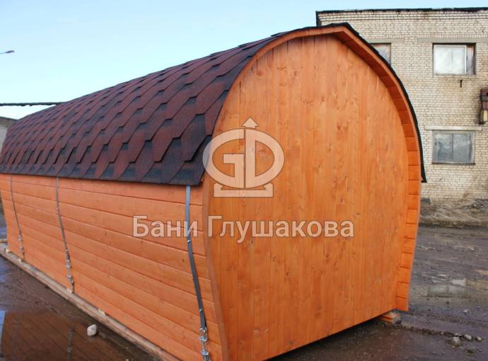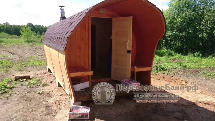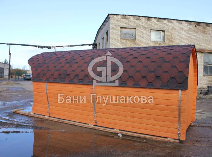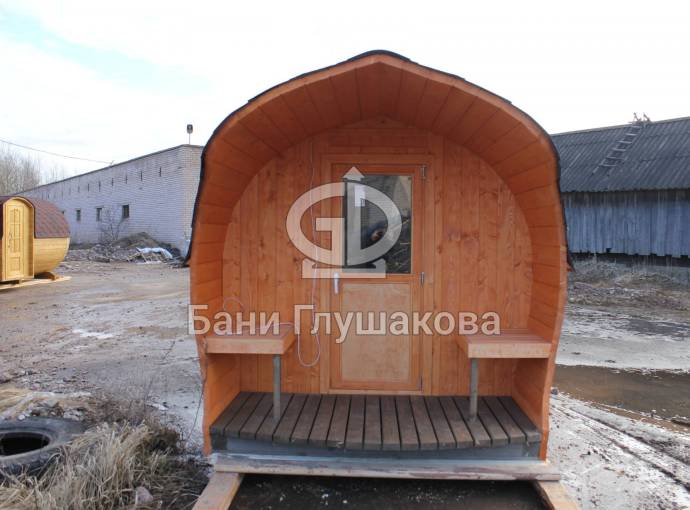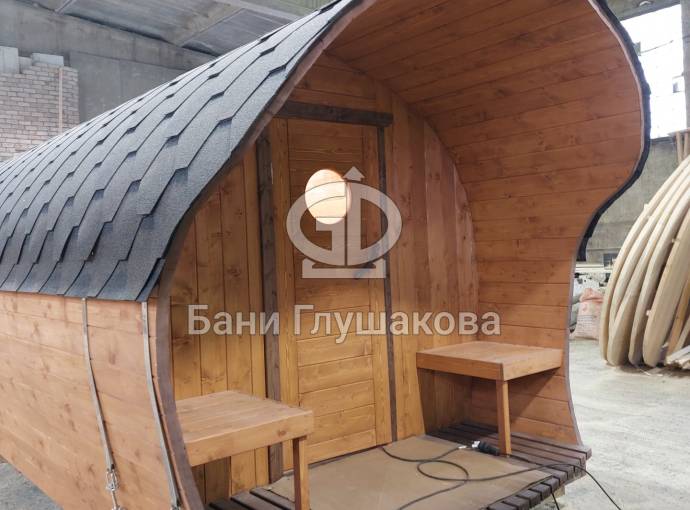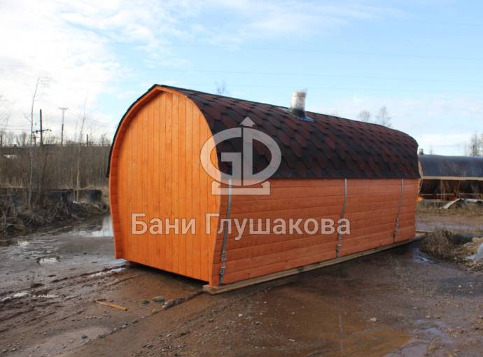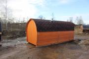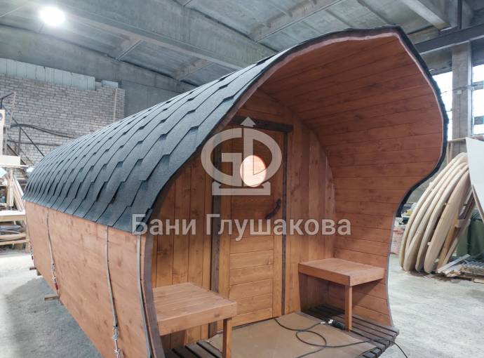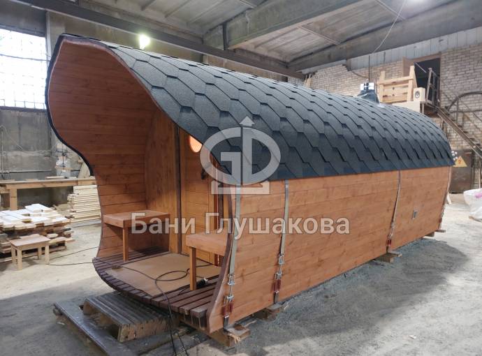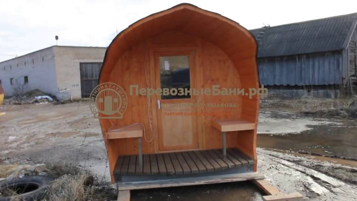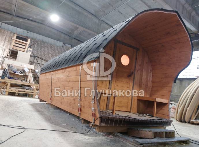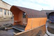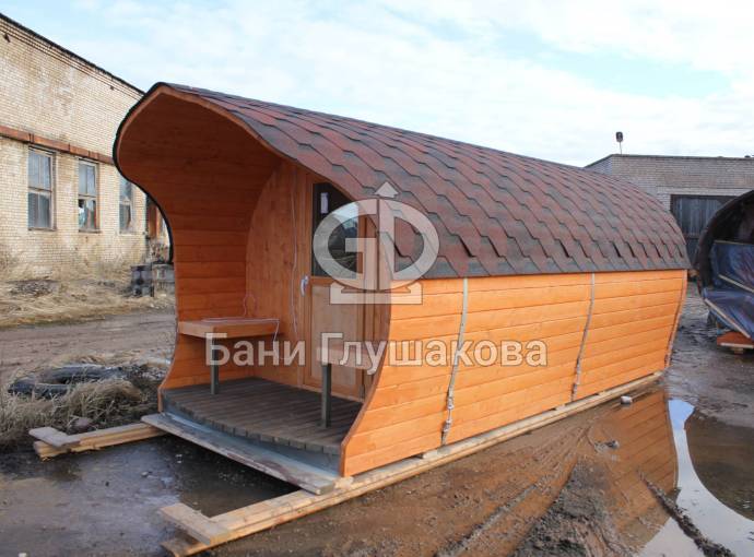 Новая модель перевозной бани в готовом исполнении из линейки куполообразных бань «София». Длина составляет 5 метров (внутренние помещения, не считая террасы). Ширина 2,2 м — максимальные габариты для мобильной бани.