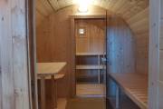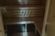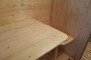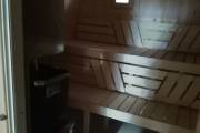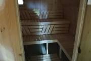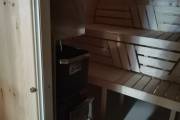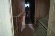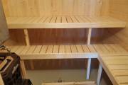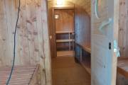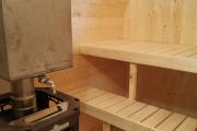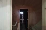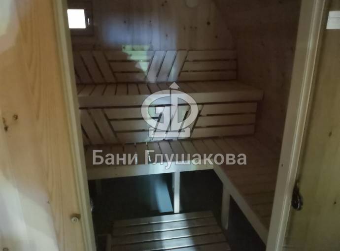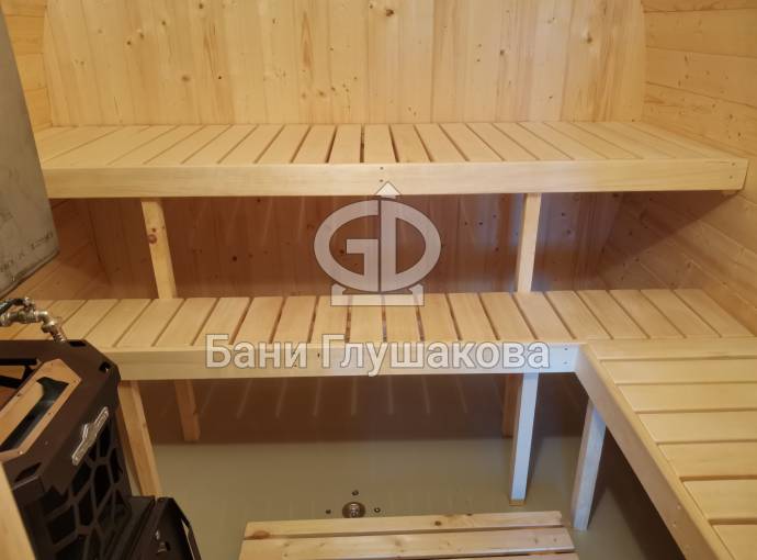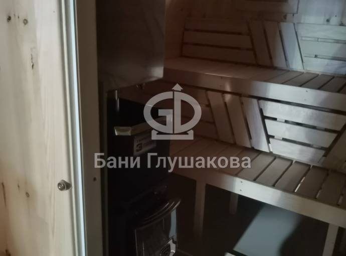 Поставлен полноразмерный двухуровневый полог углом. Печь стоит сбоку от входа. Между предбанником и парной установлена стеклянная дверь с магнитным замком. В предбаннике есть скамеечки и столик.