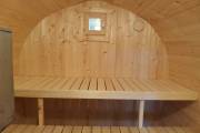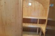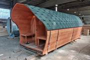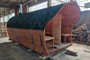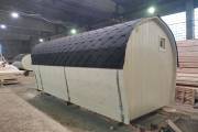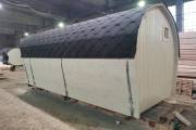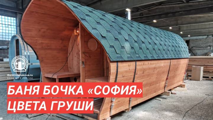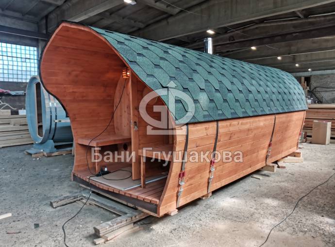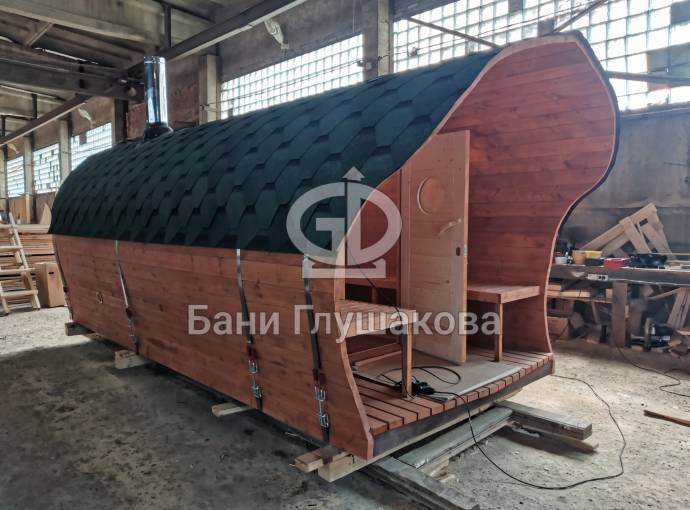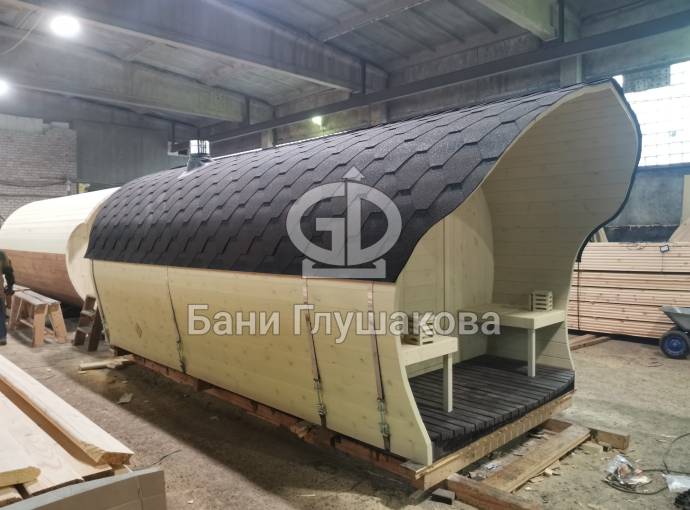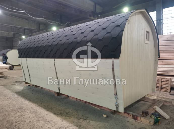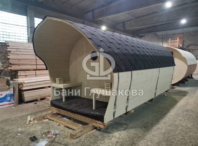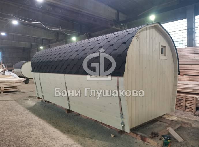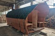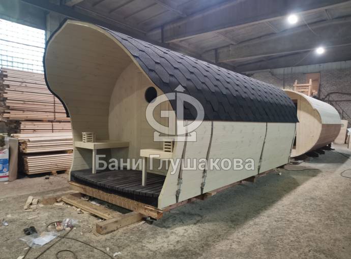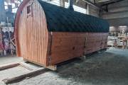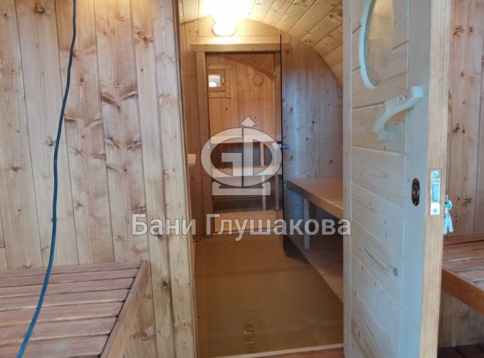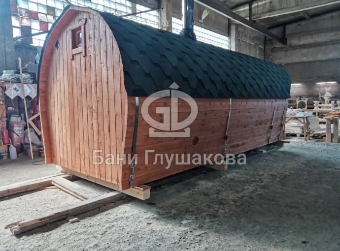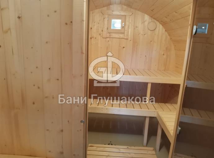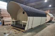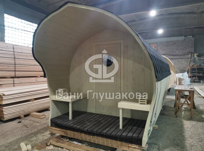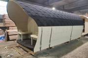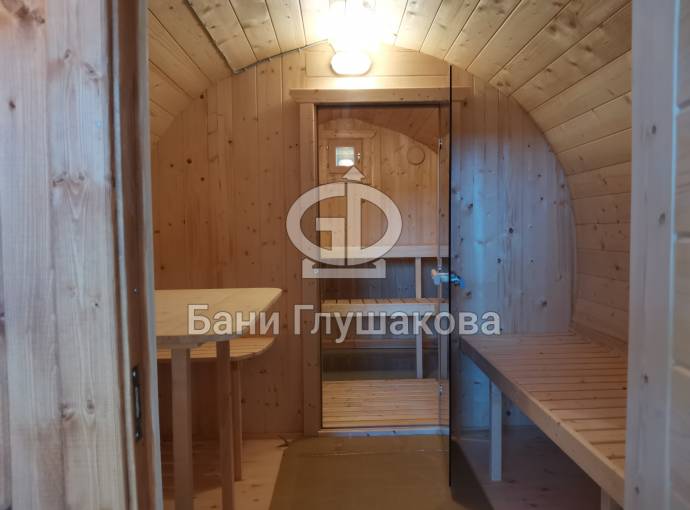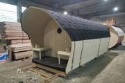 Ещё одна модель линейки куполообразных бань «София» каркасной сборки из бочковой доски. Баня пятиметровая с небольшой террасой у входа. Внутри 2 помещения: раздевалка и парная.