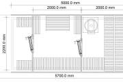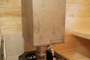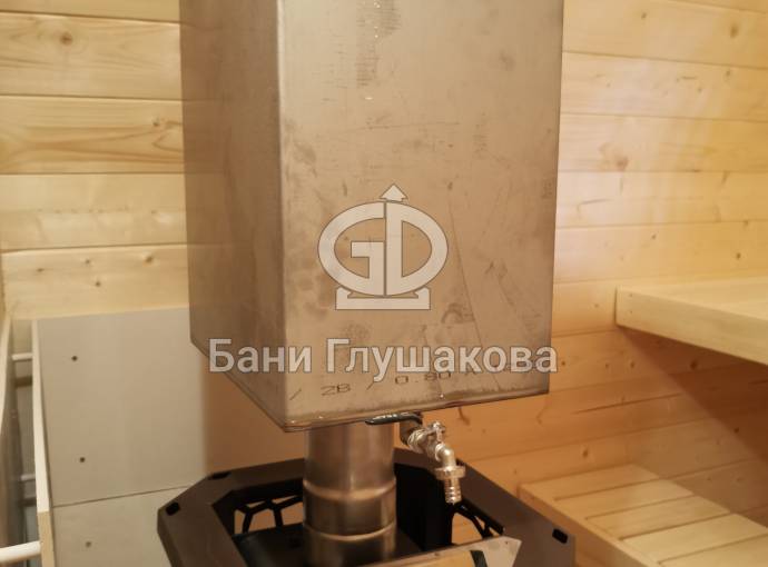 Особенность этой модели — парная, совмещённая с моечным помещением. Во всю площадь парной положен пластиковый поддон со сливом, на печи установлен бак для горячей воды — мыться можно прямо тут.