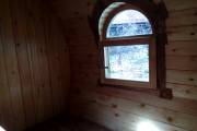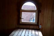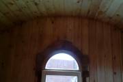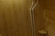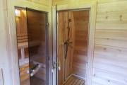Баня сделана из кедра. Из доп.опций в этой бане были установлены абажуры, свет под пологами, раздельное включение, камни, бак на трубе, нержавейка на магнезит, декоративная спинка, удлинённый нижний полог, откидные пологи 2 шт, светильник «Квадро», дополнительное окно, душевой поддон увеличили + полог в душе сделали. Стены снаружи покрашены пропиткой Тиккурила «Орегон», обводка - «Палисандр».