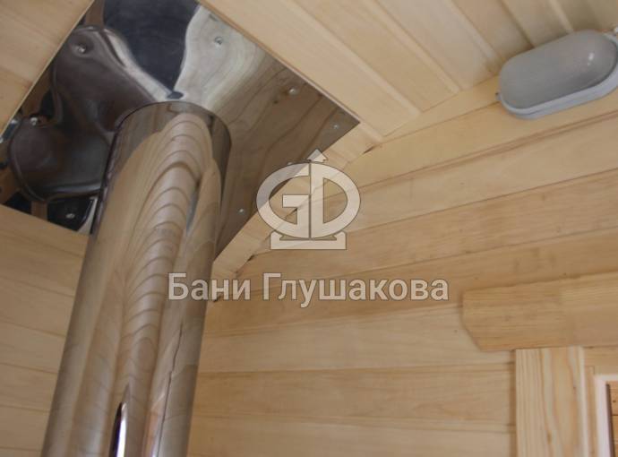Площадь чуть более 13 кв.м. позволяет вместить два отделения: комнату отдыха и парную. В предбаннике установлен комплект мебели, выведена топка. При необходимости можно рассмотреть вариант установки душевой системы (в этом проекте она по умолчанию отсутствует). В парной установлены двухуровневые полки (рассчитаны на 4-5 человек) и печь с баком на трубе.