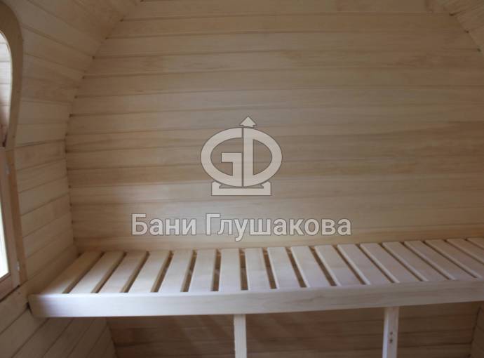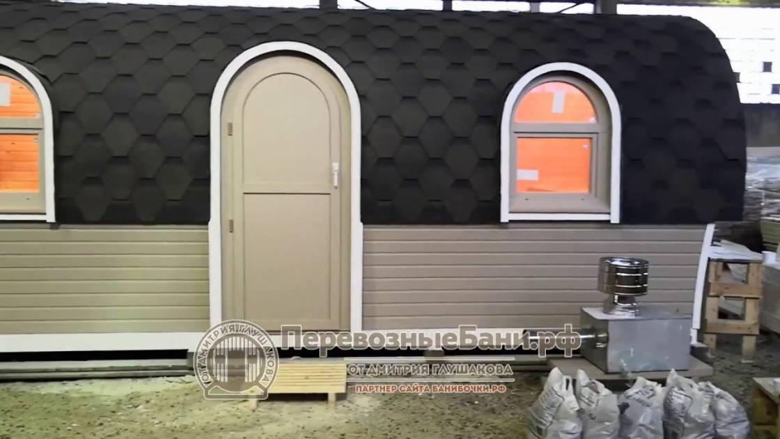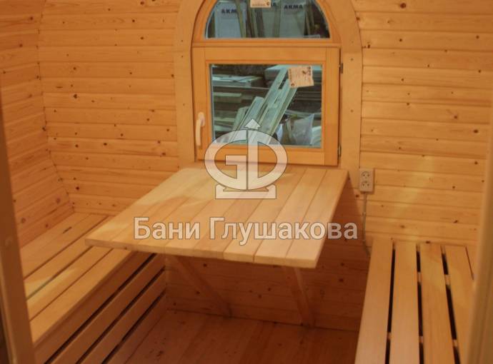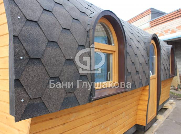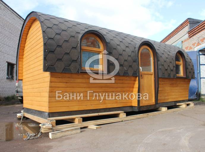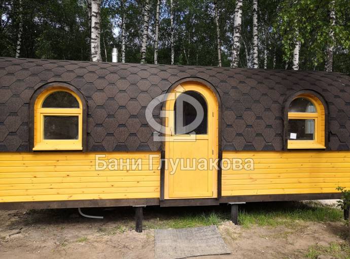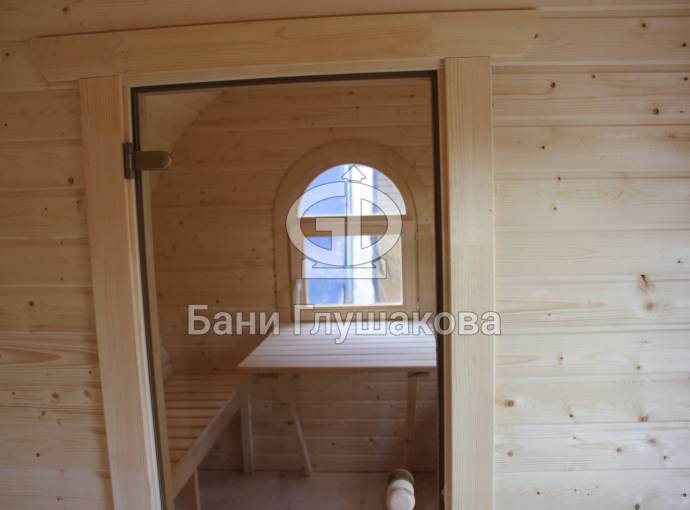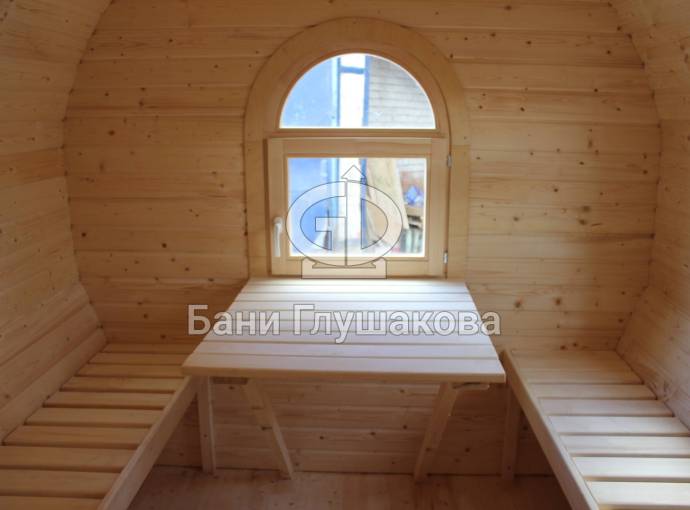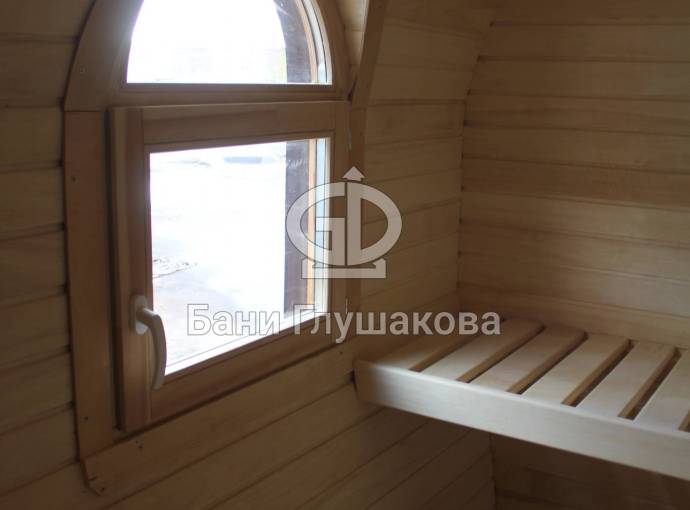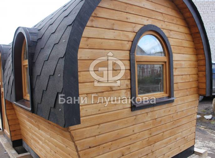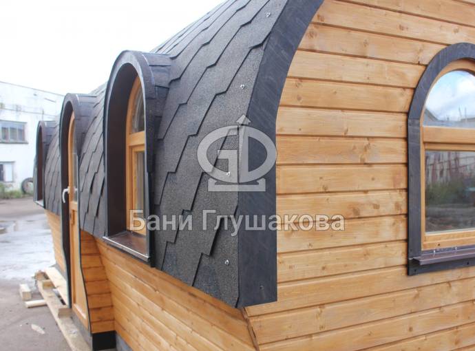 Баня отличается своеобразной трапециевидной формой с округлой крышей. Особо удачно вписались арочные окна и входная дверь — все это призвано подчеркнуть красоту и необычность модели. На фотографиях, сделанных внутри, виден сводчатый потолок. Он создает особый уют при нахождении в бане.