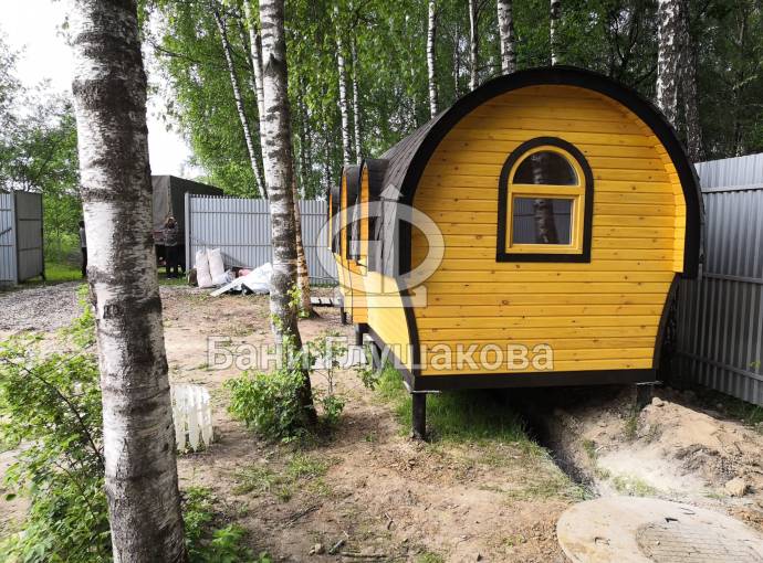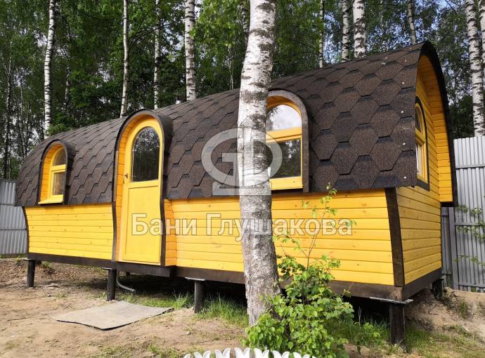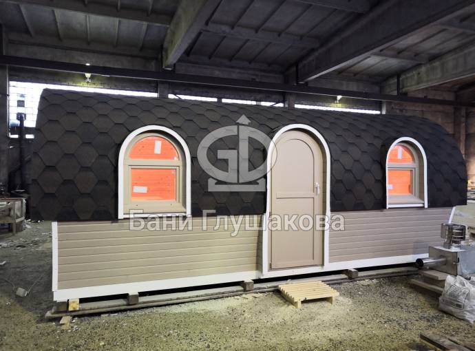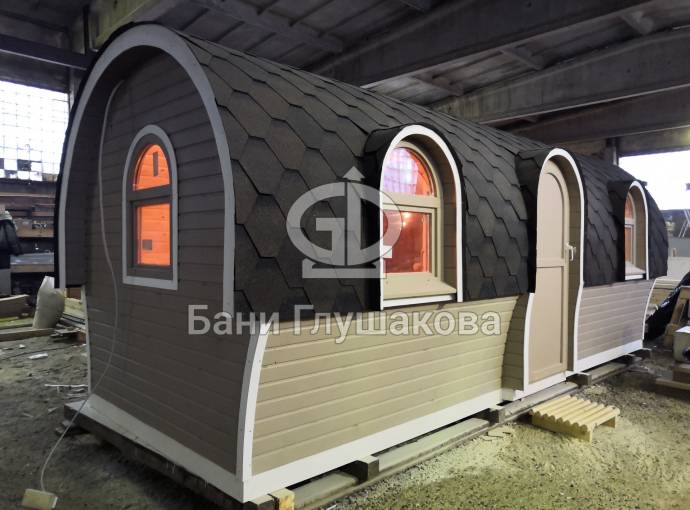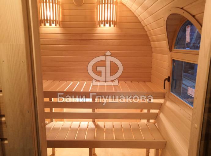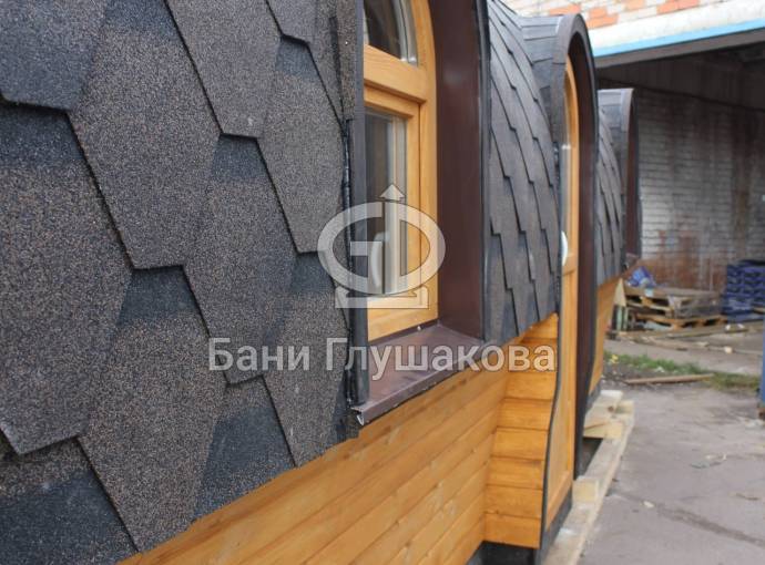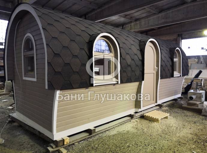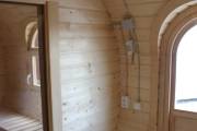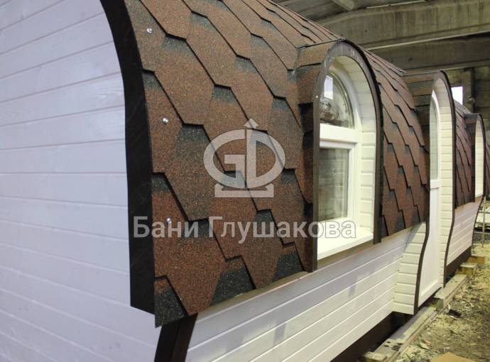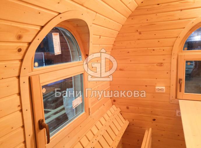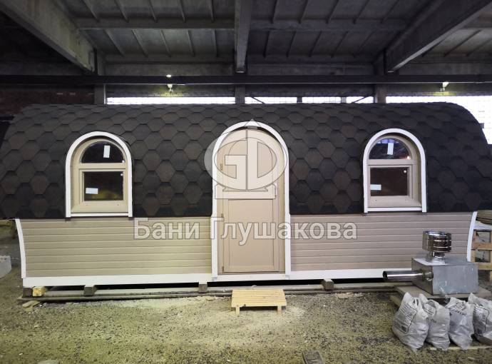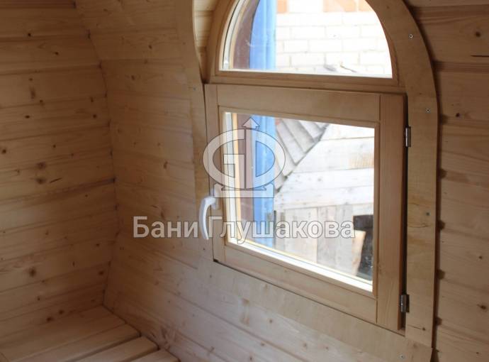 Баня отличается своеобразной трапециевидной формой с округлой крышей. Особо удачно вписались арочные окна и входная дверь — все это призвано подчеркнуть красоту и необычность модели. На фотографиях, сделанных внутри, виден сводчатый потолок. Он создает особый уют при нахождении в бане.
