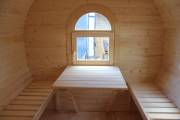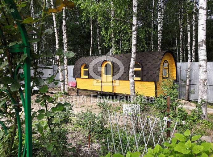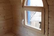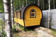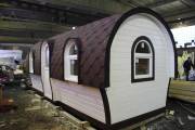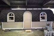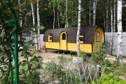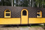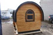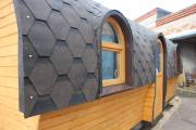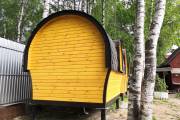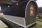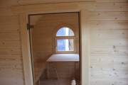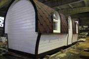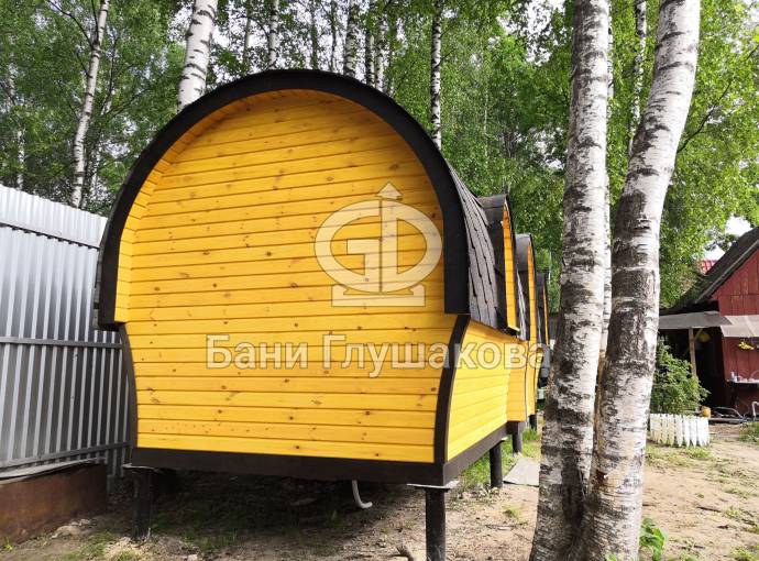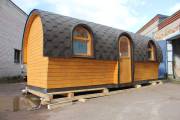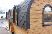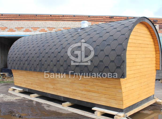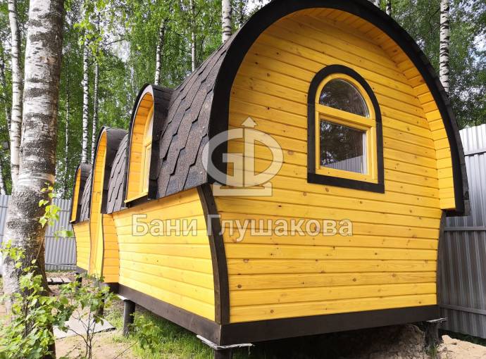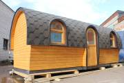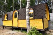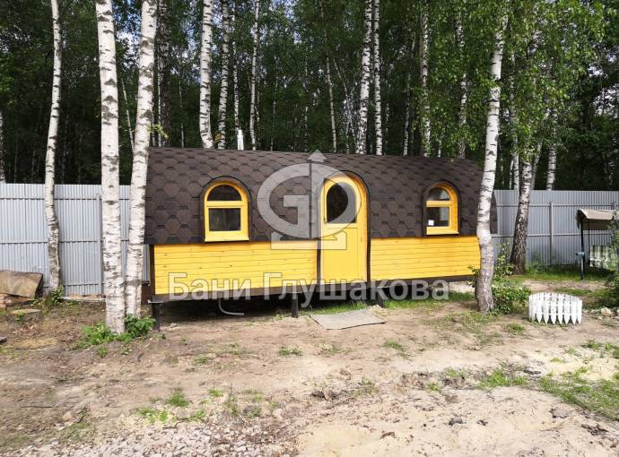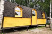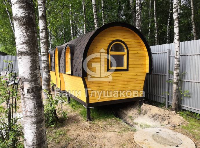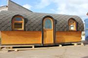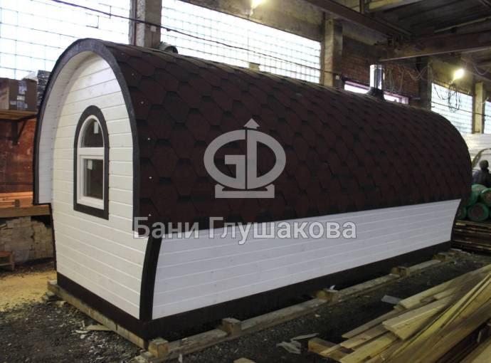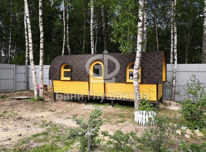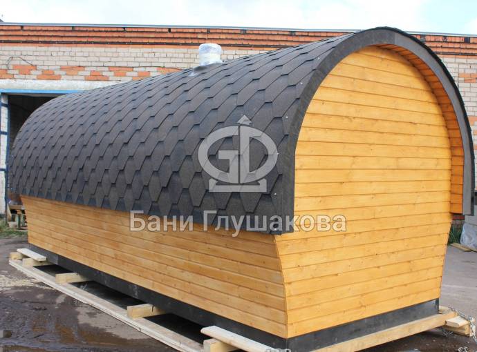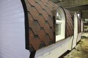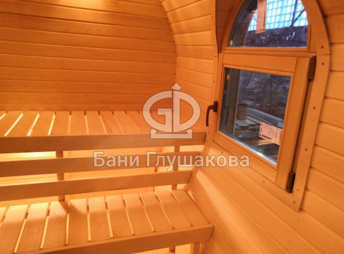 Баня отличается своеобразной трапециевидной формой с округлой крышей. Особо удачно вписались арочные окна и входная дверь — все это призвано подчеркнуть красоту и необычность модели. На фотографиях, сделанных внутри, виден сводчатый потолок. Он создает особый уют при нахождении в бане.
