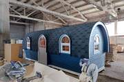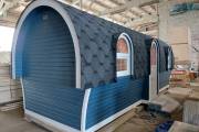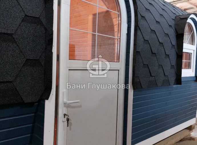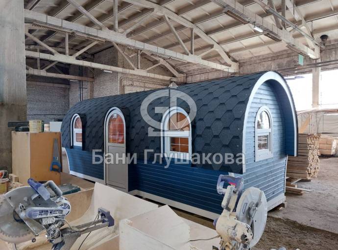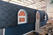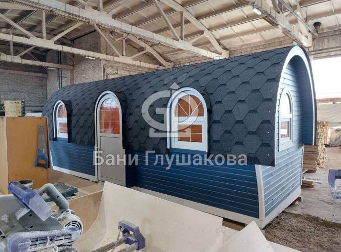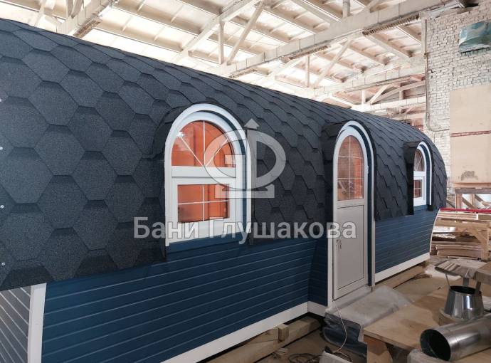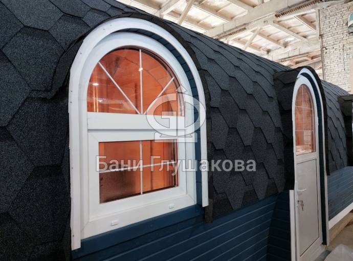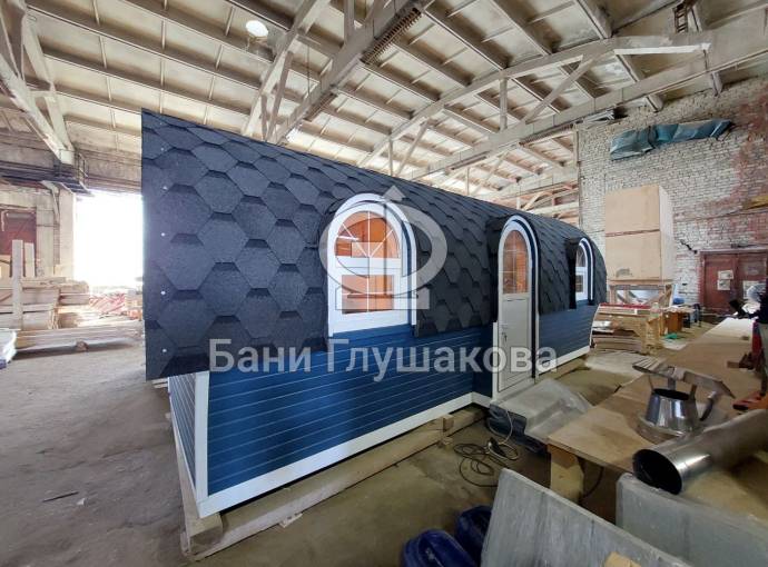 Эта баня может стать вашей. Перевозной «Сундучок» с душем 2,2х6 метров. Красивая модель с уютными арочными окошками.