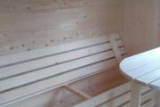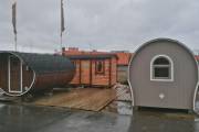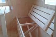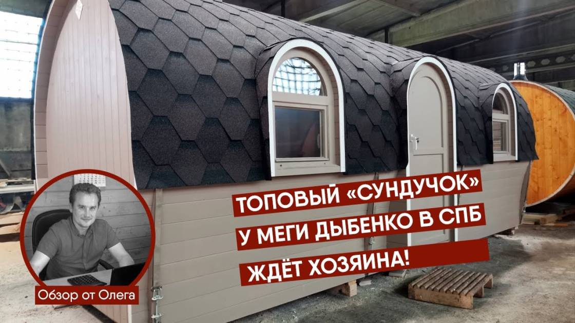 На выставку в Санкт-Петербурге привезли новую баню «Сундучок», изготовленную из бочковой доски в отличной комплектации. Баня большая шестиметровая. Внутри есть комната отдыха, душ, парная. Всё уже полностью готово к использованию — есть печка, душевое оборудование, мебель, электрика. В комнате отдыха установлены лавочки с откидными крышками с местом для хранения.