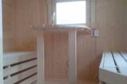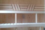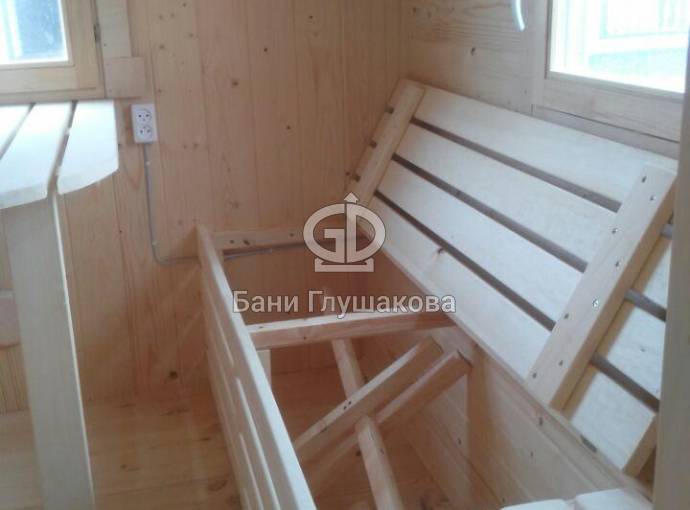 Планировка лучше, чем в стандартных «Сундучках» — есть небольшой тамбур, отделяющий комнату отдыха от душа и парной. Так легче сохранять чистоту и порядок. Душевая кабина не проходная — это отдельное небольшое помещение, закрытое стеклянной дверью. Под трапиком установлен пластиковый поддон. Душевое оборудование вынесено в отдельный закуток, чтобы не мешало.
