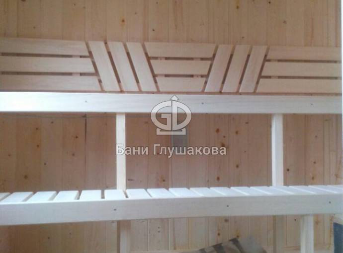 В парной установлены осиновые пологи с красивой спинкой. Сделана нижняя подсветка, повешены красивые светильники. Вентиляция — само собой.