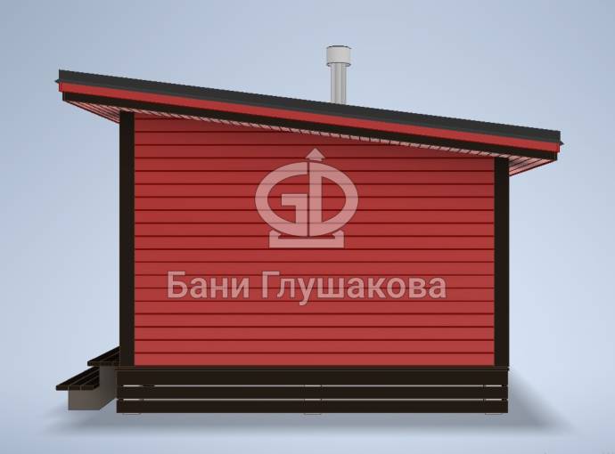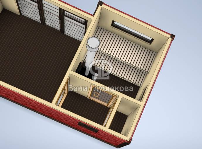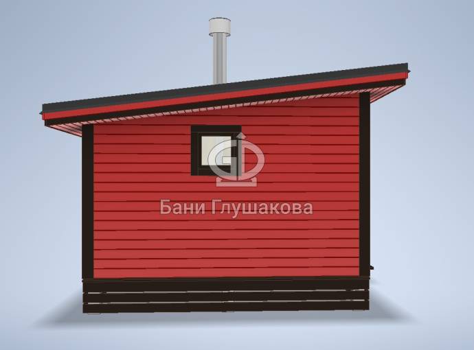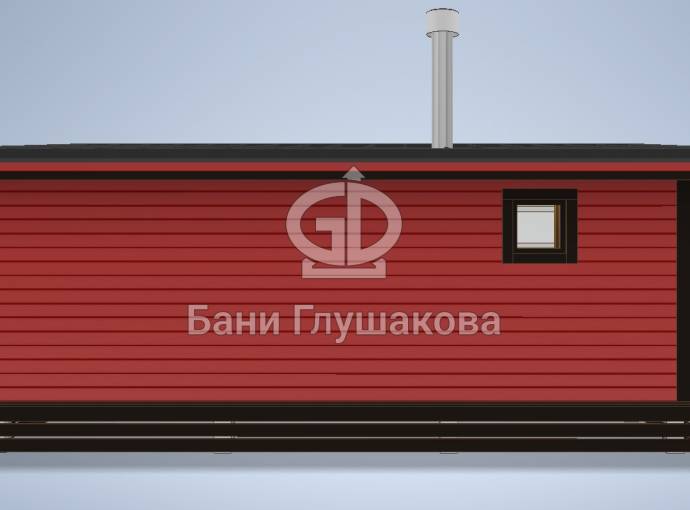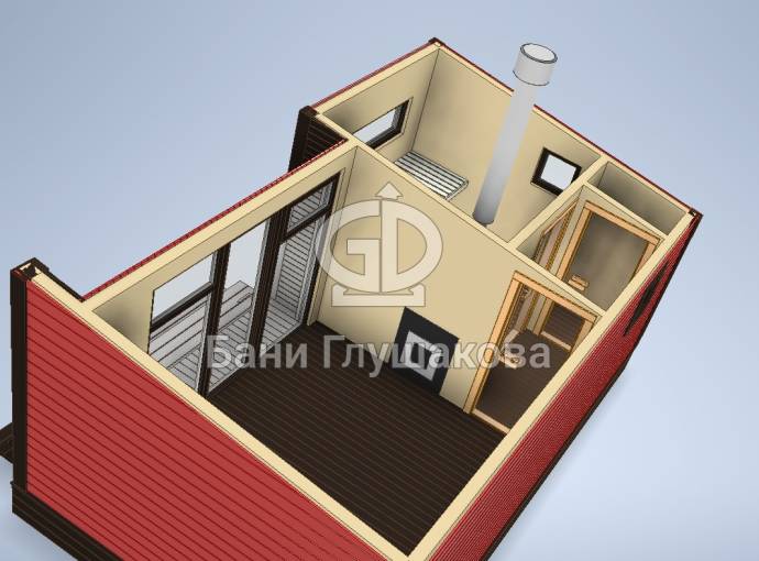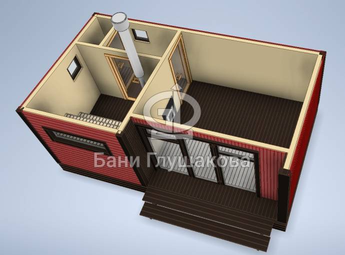 Баня строится по каркасной технологии. Наружная отделка доской внахлёст или имитацией бруса на выбор. Изнутри стены обшиваются бессучковой вагонкой. В парной устанавливается печь с выносной топкой через стену в комнату отдыха.
