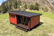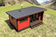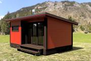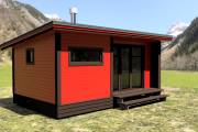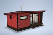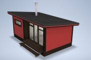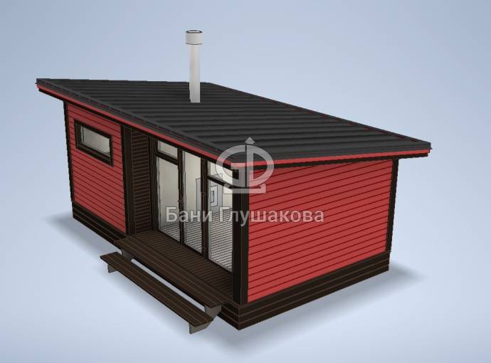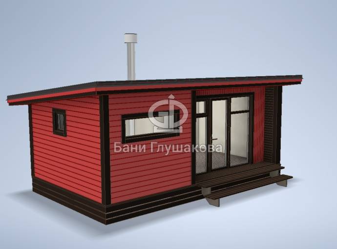 Новый проект в линейке бань «Суоми» с большими панорамными окнами разработан в середине апреля 2022 года. Теперь каркасная баня с односкатной крышей 3,5х6 может быть не только в перевозном варианте, но и в классическом стационарном со сборкой на участке. Модель оснащена небольшой террасой.