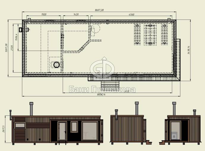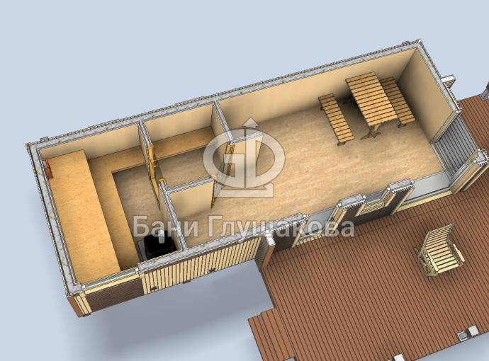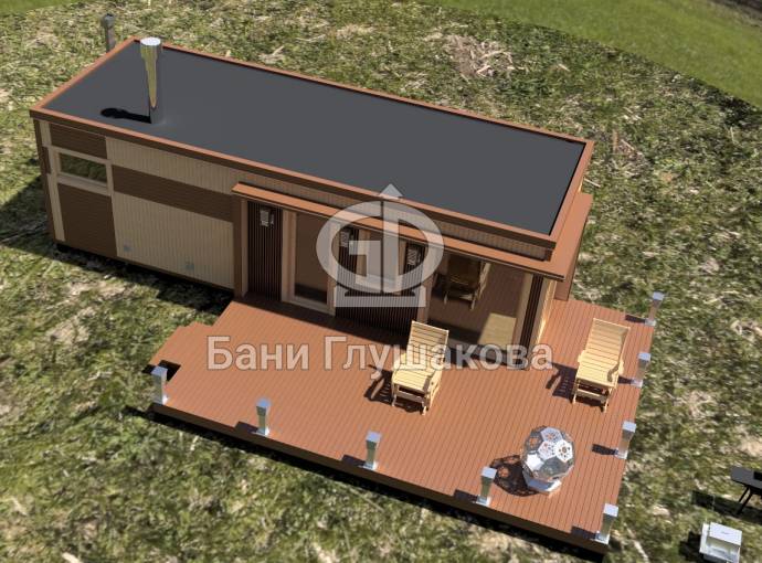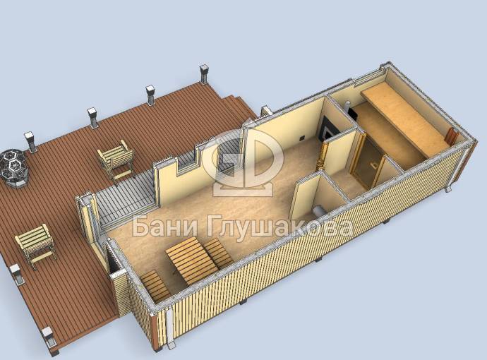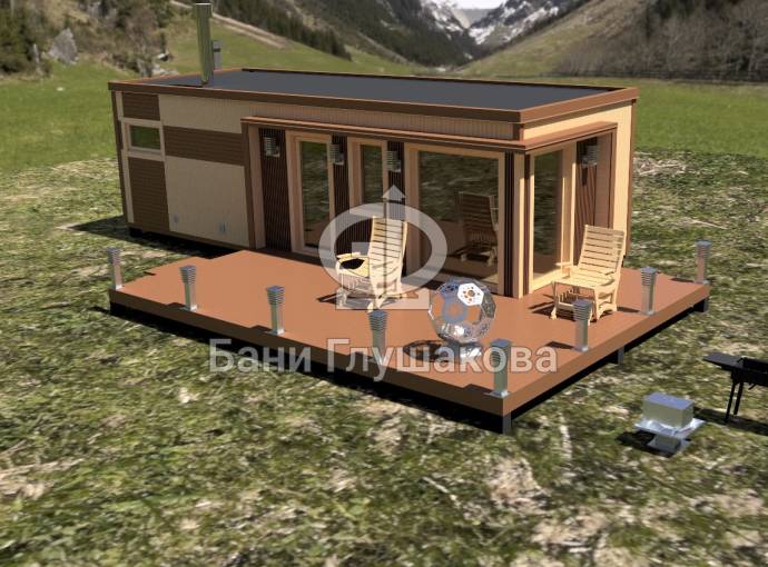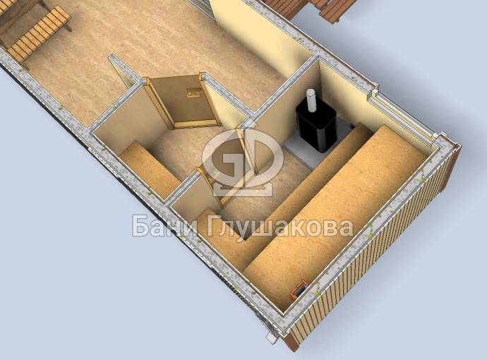 Стандартно внутри 3 отделения: просторная комната отдыха, душевая и парная. Можно выделить место для санузла.