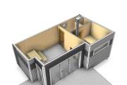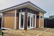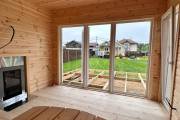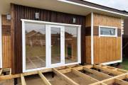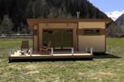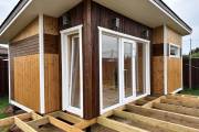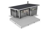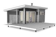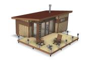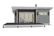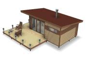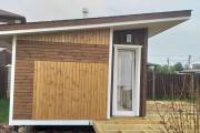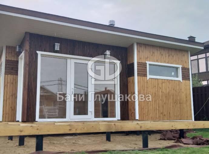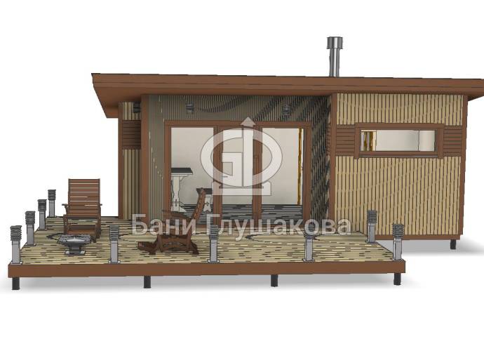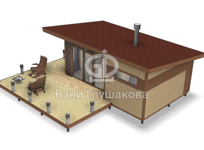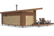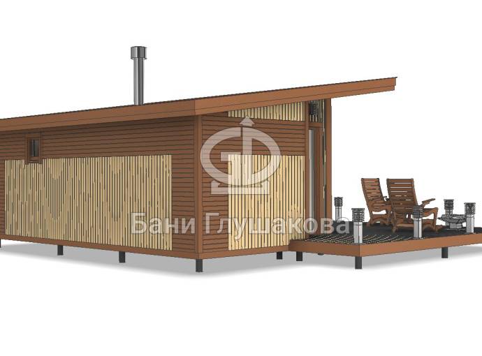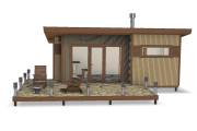 Это каркасная баня «Суоми» с наружной отделкой планкеном. Как все бани этой линейки она оснащена эффектными панорамными окнами. Но главная фишка проекта — большая открытая терраса, на которой будет организована зона отдыха.