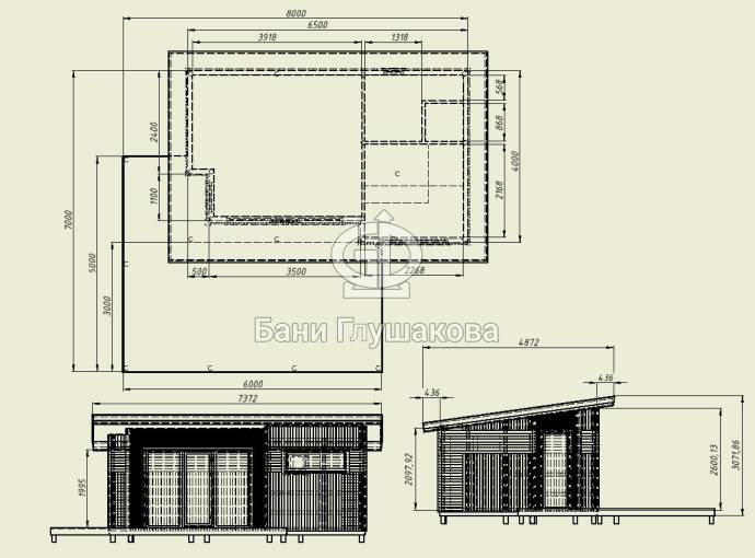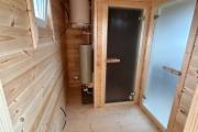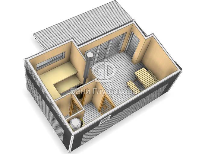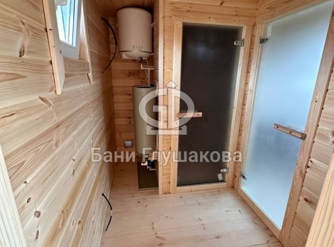 Размер 4 на 6,5 метров. Планировка предполагает наличие комнаты отдыха, парной, душевого помещения и раздевалки. По факту места хватает, чтобы сделать отдельный санузел.