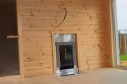Если топка через стену то можно сделать красивые наличники из брашированной доски с полочкой на верху,