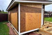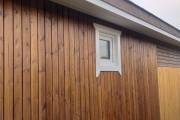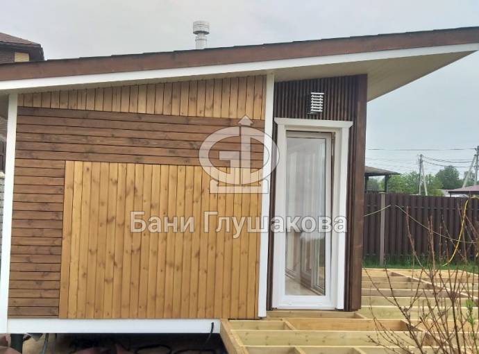 Сухая, строганная, покрашенная и только потом установленная доска внахлест одна на другую, (если это баня «Барн», то обшивается имитацией бруса), если баня «Кубота», то планкеном.
