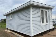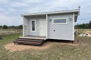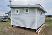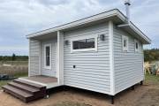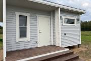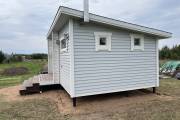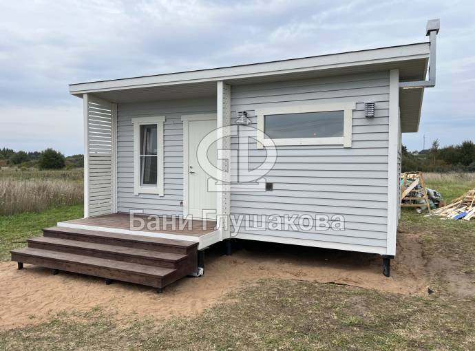 Линейка каркасных бань «Суоми» приобрела ещё один современный проект в скандинавском стиле. Это небольшая одноэтажная баня с односкатной крышей, высокими окнами и маленькой террасой. Размер 4 на 6 метров.