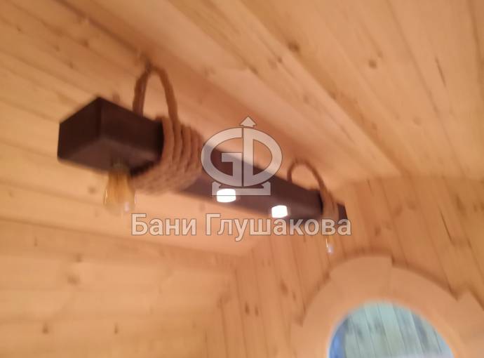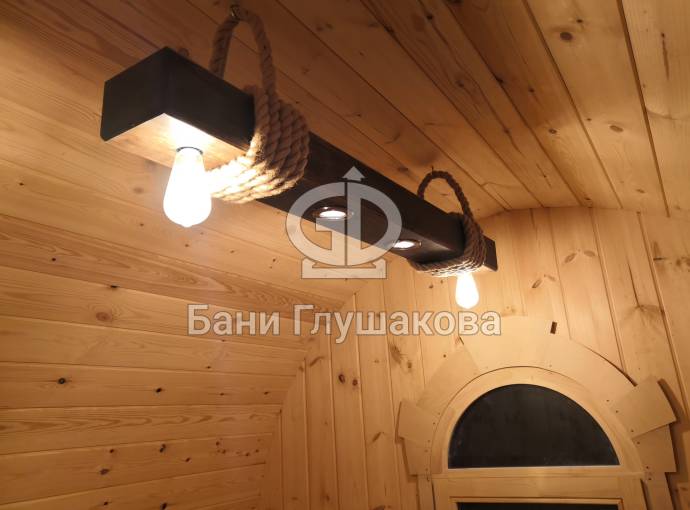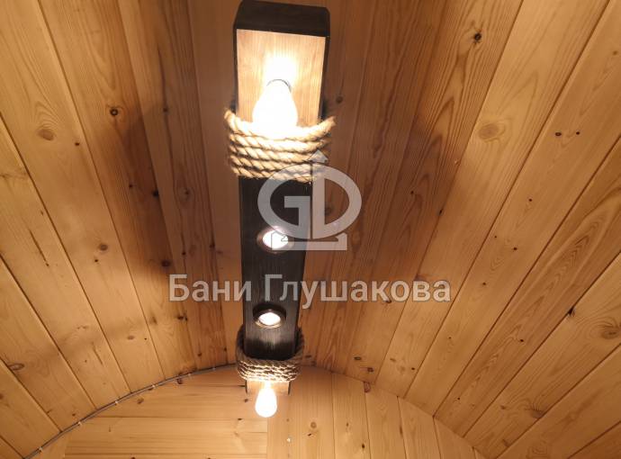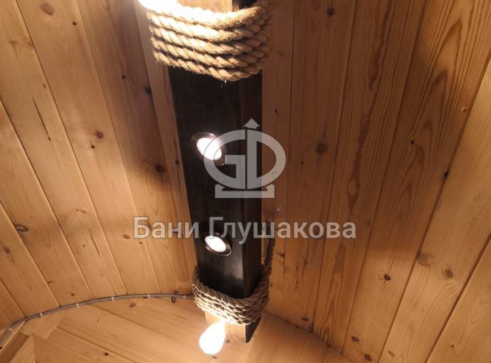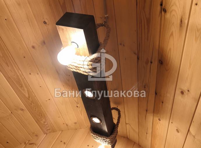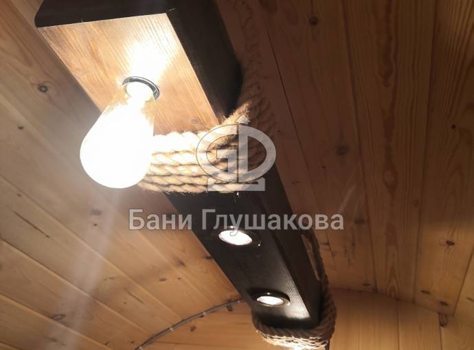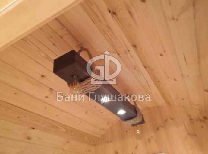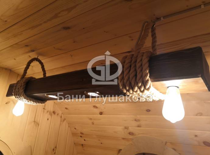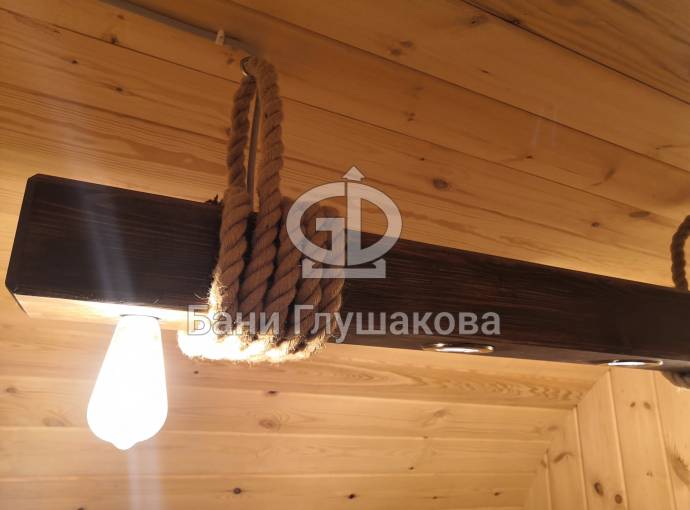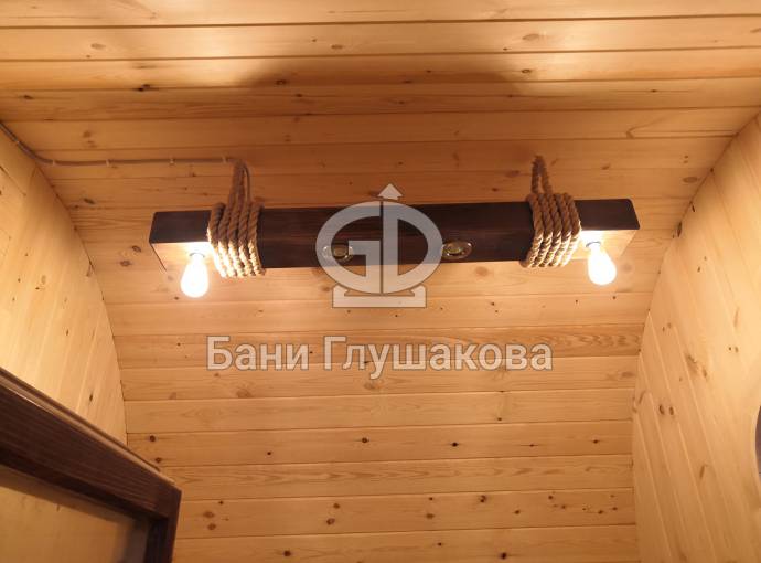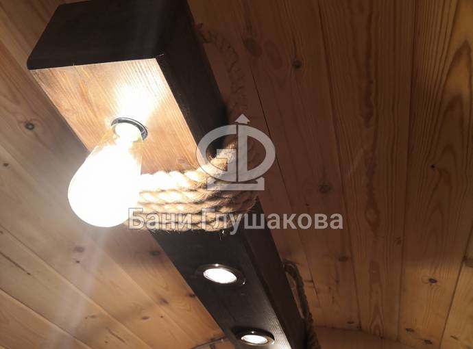 Эту люстру можно установить не во все бани — надо учитывать тот нюанс, что «Брусина» свисает на 35 см от потолка с учетом ламп. Ее, конечно, можно закрепить непосредственно на потолок — тогда она будет висеть чуть выше.