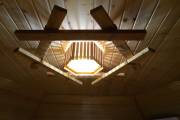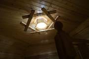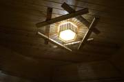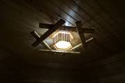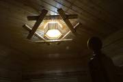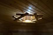 Досочки, использованные при создании этого потолочного светильника для бани, обработаны особым способом — брашировкой, — это искусственное старение доски. На фото представлена модель из кедра: у него и фактура более объемная, и оттенок благородный розовый, и запах потрясающе свежий. Конструкция скреплена грубой канатной веревкой, что придает люстре такой типично деревенский рустикальный стиль.