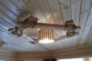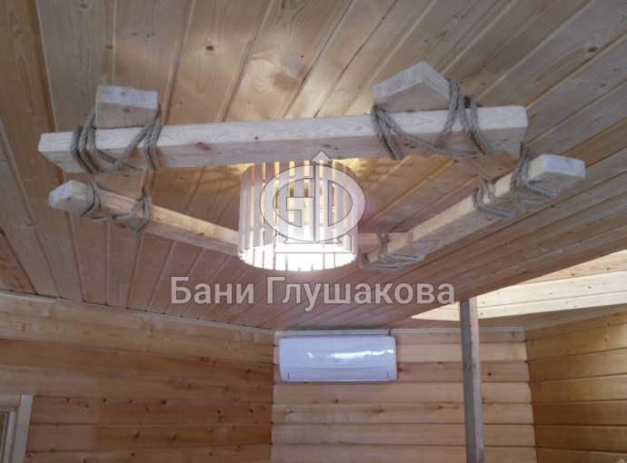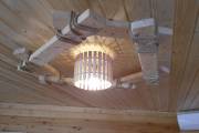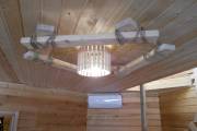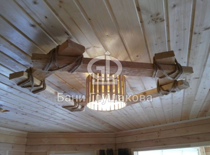 Создать уютный аутентичный интерьер в бане поможет специально созданная для этой цели деревянная люстра из состаренного (брашированного) кедра. Оригинальная конструкция из центрального светильника обрамлена грубой кедровой доской, связанной декоративным канатным шнуром. Проверено — эта люстра на всех производит потрясающий ВАУ-эффект. Потому что необычно, стильно, экологично. А главное — отражает стремление хозяина создать неповторимую атмосферу в бане.