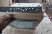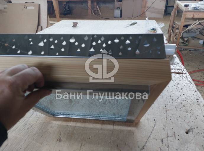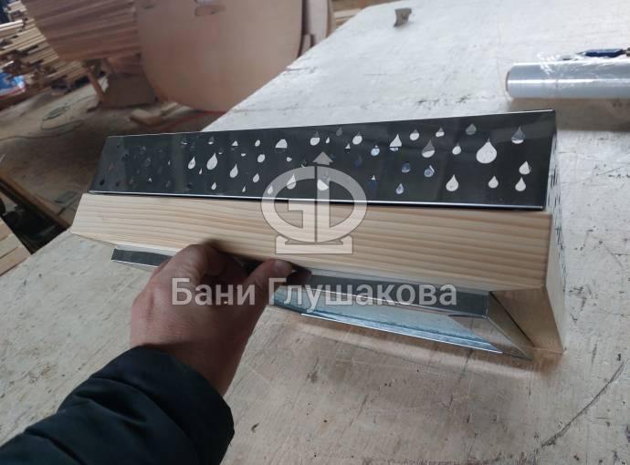 Дизайнерская люстра из комбинированных материалов «Капли» изготовлена специально для украшения бань Дмитрия Глушакова. Состоит из деревянной и металлической оправы с узорами капель. Снизу лампочка закрыта стеклом с декоративным узором.