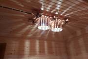 Двойная люстра «Тринити» изготовлена специально для перевозных бань Дмитрия Глушакова. Состоит из двух деревянных плафонов из реечек и прямоугольного каркаса, декорированного канатом.