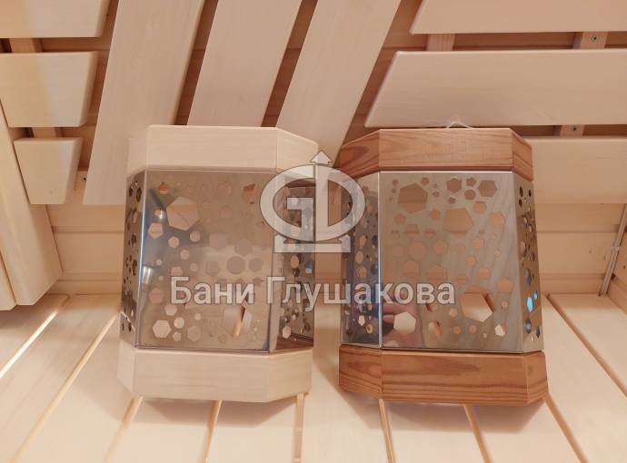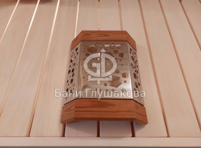 Производим и реализуем оригинальные абажуры и светильники и саун. Новая модель называется «Многоугольники» и изготовлена из нержавеющей стали и деревянных элементов из термодоски.