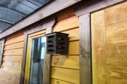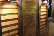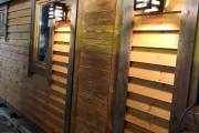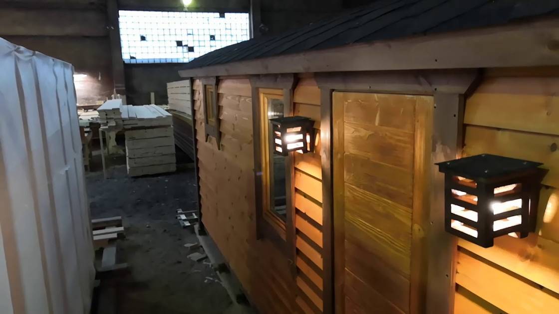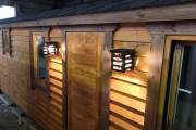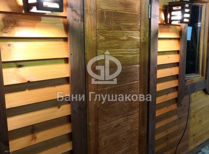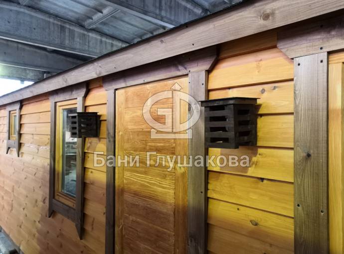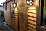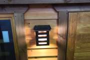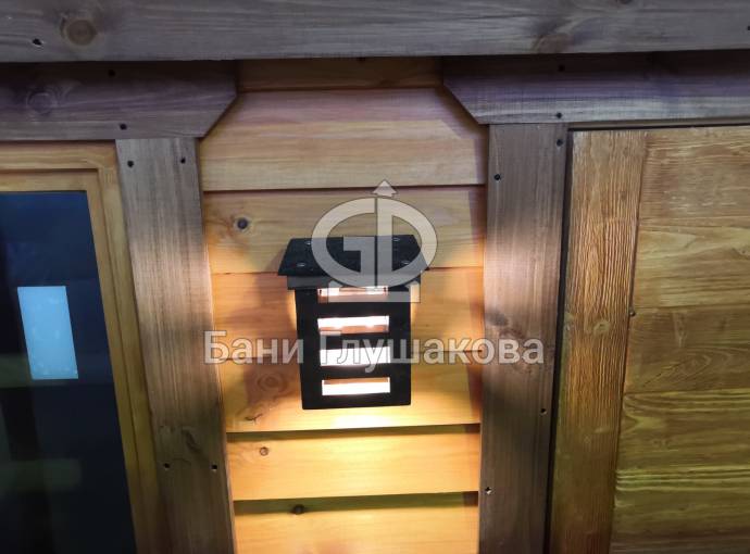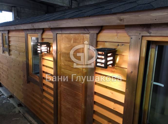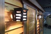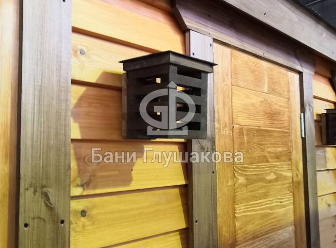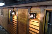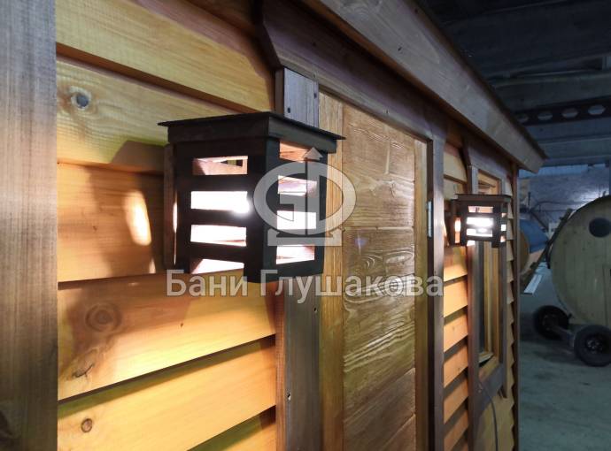 В качестве дополнительной опции предлагаем декоративные уличные настенные светильники для бани, изготовленные из деревянных брусочков. Покрашены. Сверху покрыты мягкой черепицей. Роскошно смотрятся при симметричном расположении по бокам от двери.