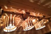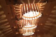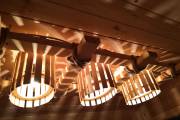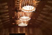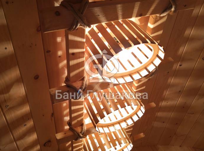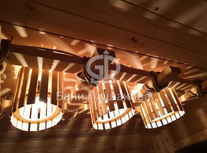 Потолочная люстра «Тринити» для тех, кто любит побольше света в бане. В дизайнерской задумке — три деревянных плафона, вписанные в прямоугольник. В качестве декора — грубоватый рустикальный канат.