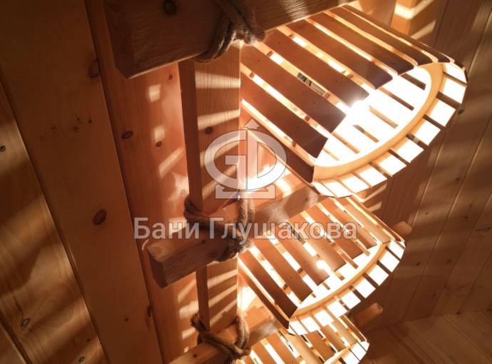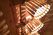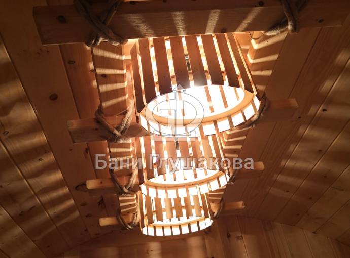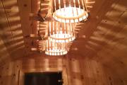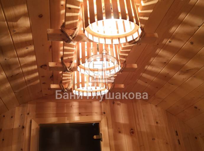Этот светильник довольно большой и его можно установить в бани линейки «Буханочка», бани-бочки увеличенного диаметра от 2.2м, а также как в данном случае — в Мега баню (овальную бочку шириной 3 метра).